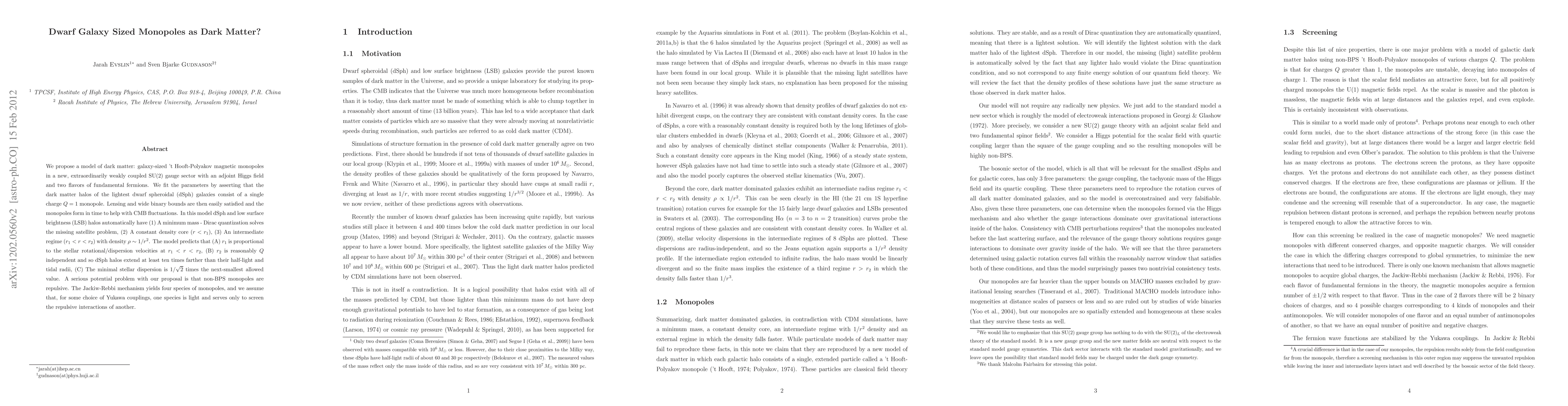This paper proposes a novel dark matter model based on 't Hooft-Polyakov magnetic monopoles in a weakly coupled SU(2) gauge sector, suggesting that the dark matter halos of dwarf galaxies consist of a single monopole. The model addresses the missing satellite problem and predicts specific structural properties of these halos, while acknowledging the challenge of repulsive monopole interactions.