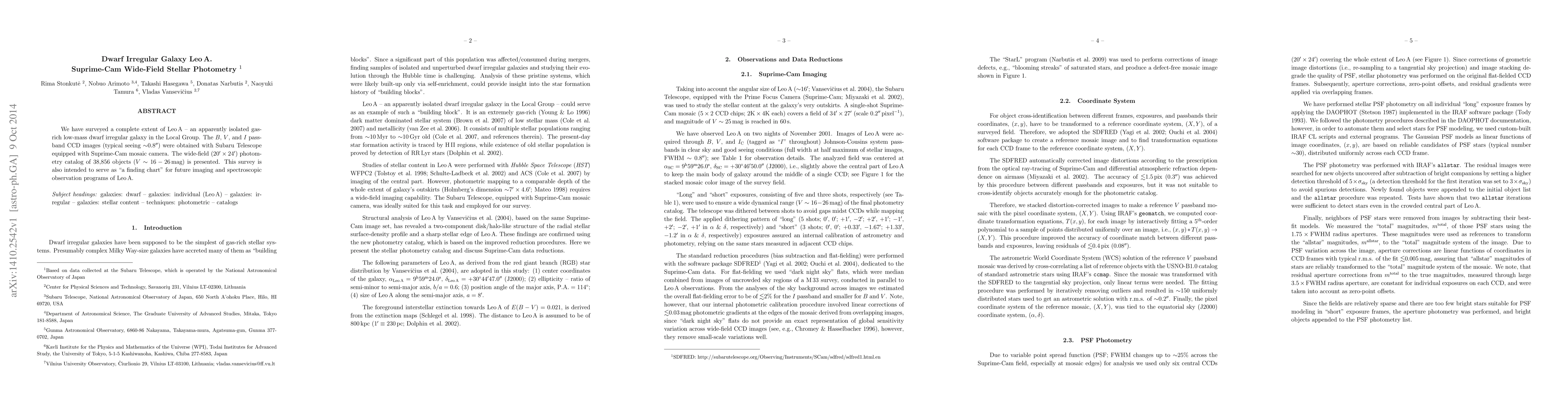 This study presents wide-field stellar photometry of the dwarf irregular galaxy Leo A using the Subaru Telescope's Suprime-Cam, resulting in a catalog of 38,856 objects. The survey aims to facilitate future imaging and spectroscopic observations of this gas-rich, low-mass galaxy in the Local Group.