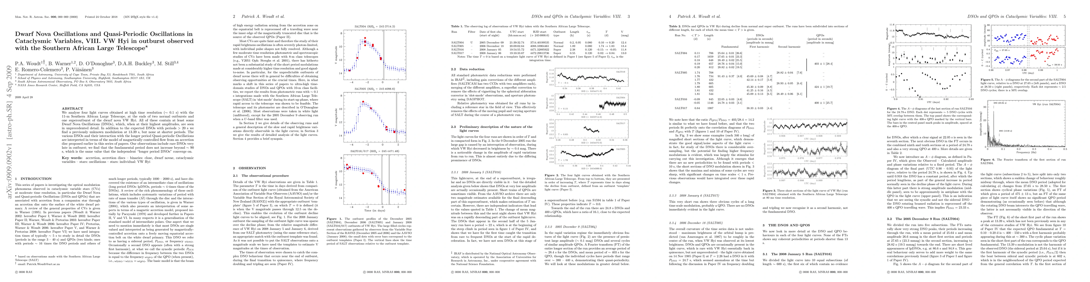 This study analyzes high-resolution light curves of the dwarf nova VW Hyi, revealing unprecedented detail of Dwarf Nova Oscillations (DNOs) and a new modulation at 13.39 s. The findings support the magnetically controlled flow model and show that DNOs do not exceed ~90 s in period.
