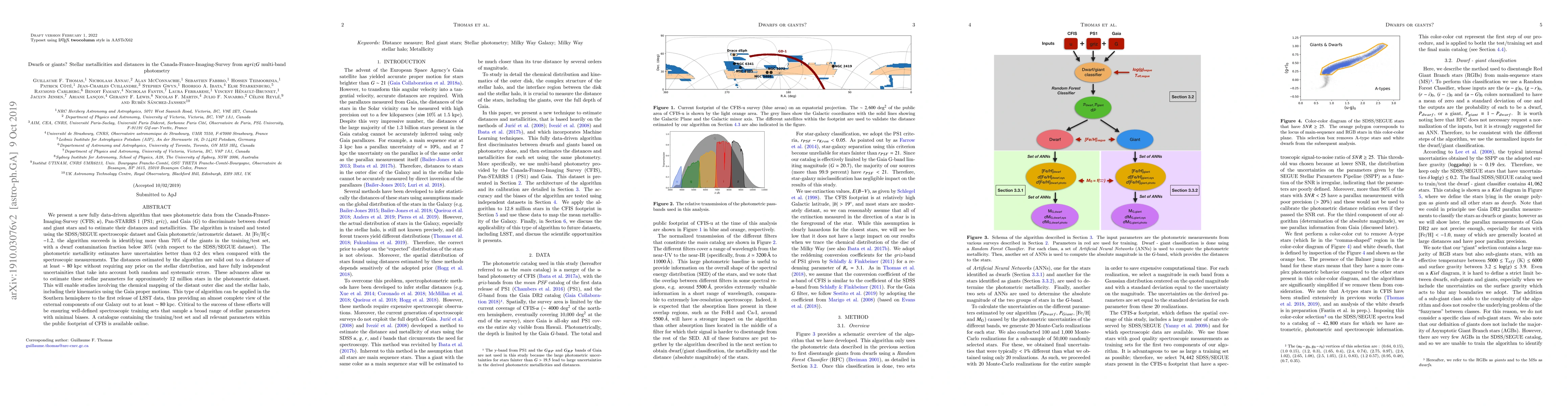 We present a new fully data-driven algorithm that uses photometric data from the Canada-France-Imaging-Survey (CFIS; $u$), Pan-STARRS 1 (PS1; $griz$), and Gaia ($G$) to discriminate between dwarf and giant stars and to estimate their distances and metallicities. The algorithm is trained and tested using the SDSS/SEGUE spectroscopic dataset and Gaia photometric/astrometric dataset. At [Fe/H]$<-1.2$, the algorithm succeeds in identifying more than 70% of the giants in the training/test set, with a dwarf contamination fraction below 30% (with respect to the SDSS/SEGUE dataset). The photometric metallicity estimates have uncertainties better than 0.2 dex when compared with the spectroscopic measurements. The distances estimated by the algorithm are valid out to a distance of at least $\sim 80$ kpc without requiring any prior on the stellar distribution, and have fully independent uncertainities that take into account both random and systematic errors. These advances allow us to estimate these stellar parameters for approximately 12 million stars in the photometric dataset. This will enable studies involving the chemical mapping of the distant outer disc and the stellar halo, including their kinematics using the Gaia proper motions. This type of algorithm can be applied in the Southern hemisphere to the first release of LSST data, thus providing an almost complete view of the external components of our Galaxy out to at least $\sim 80$ kpc. Critical to the success of these efforts will be ensuring well-defined spectroscopic training sets that sample a broad range of stellar parameters with minimal biases. A catalogue containing the training/test set and all relevant parameters within the public footprint of CFIS is available online.