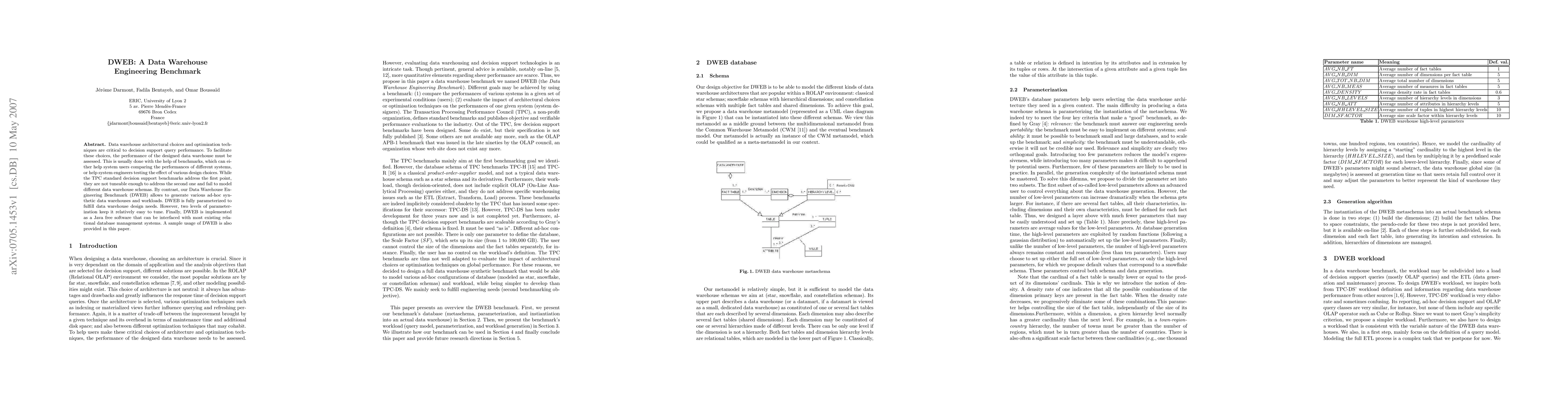 The DWEB benchmark facilitates data warehouse design and optimization by generating customizable synthetic data warehouses and workloads, addressing limitations of existing TPC benchmarks. Implemented as Java free software, it interfaces with most relational database management systems.