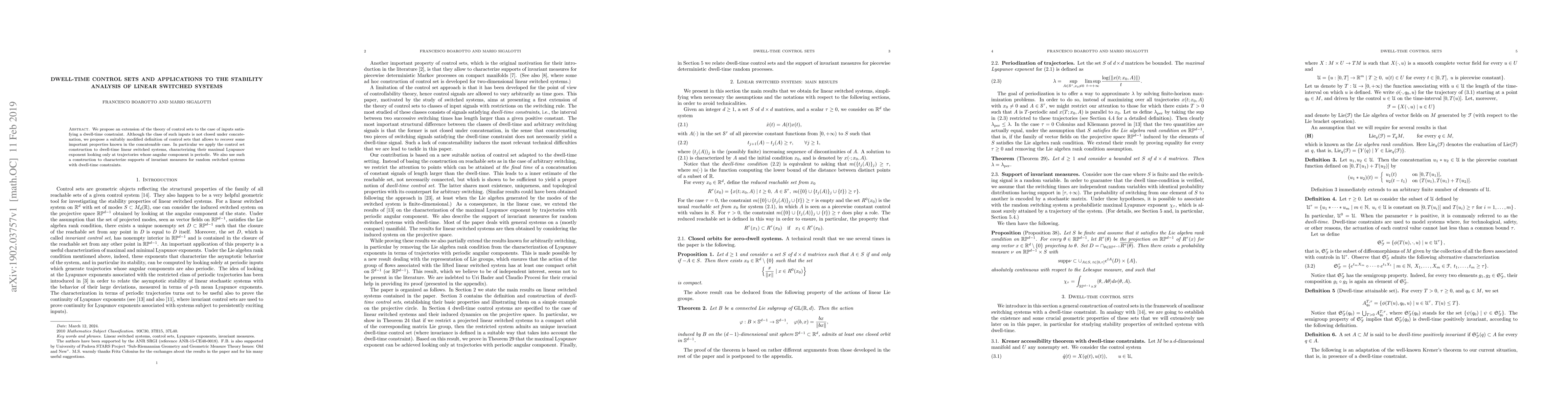 This paper extends the theory of control sets to inputs with dwell-time constraints, proposing a modified definition to retain key properties. It applies this to analyze the stability of linear switched systems, focusing on maximal Lyapunov exponents and invariant measures for random switched systems.