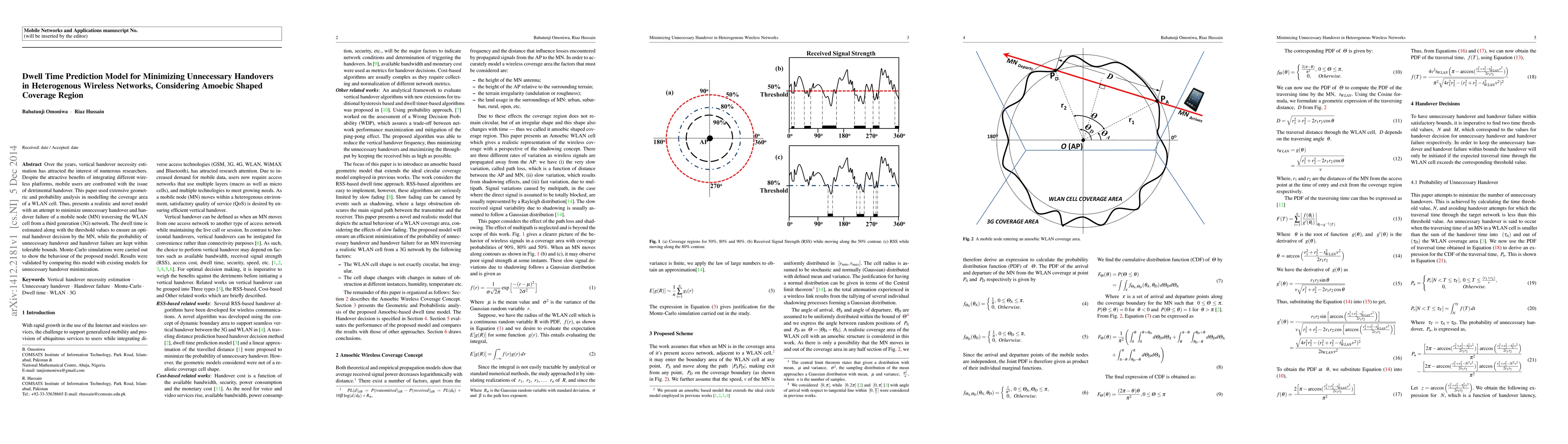 This paper proposes a dwell time prediction model to minimize unnecessary handovers in heterogeneous wireless networks, particularly focusing on amoebic shaped coverage regions. The model estimates dwell time and threshold values to optimize handover decisions, reducing unnecessary handovers and failures, validated through Monte-Carlo simulations and comparison with existing models.