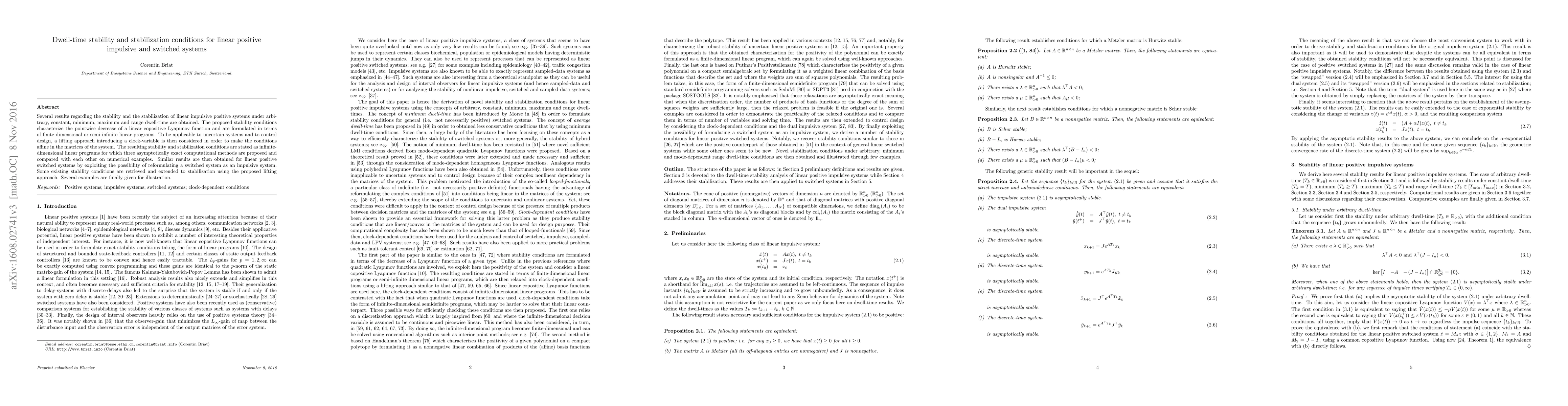 This paper investigates stability and stabilization conditions for linear positive impulsive and switched systems under various dwell-time constraints. It proposes stability conditions using copositive Lyapunov functions and formulates them as linear programs, extending them to uncertain systems via a lifting approach.