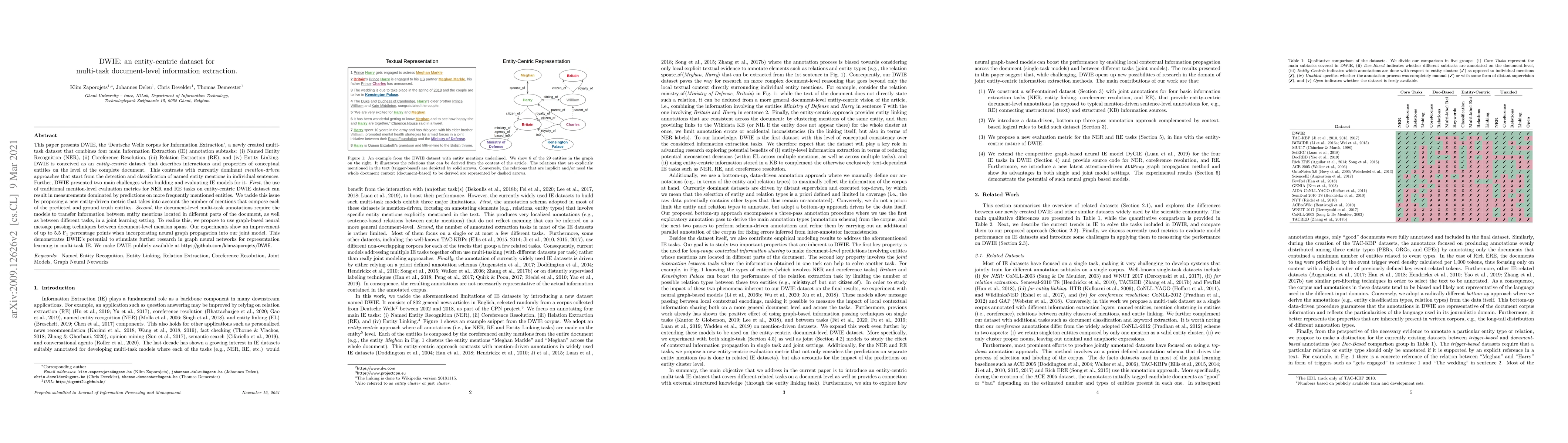 DWIE is an entity-centric dataset for multi-task document-level information extraction, combining NER, Coreference Resolution, Relation Extraction, and Entity Linking. It addresses evaluation and model transfer challenges with new entity-driven metrics and graph-based neural techniques, showing a 5.5 F1 improvement.