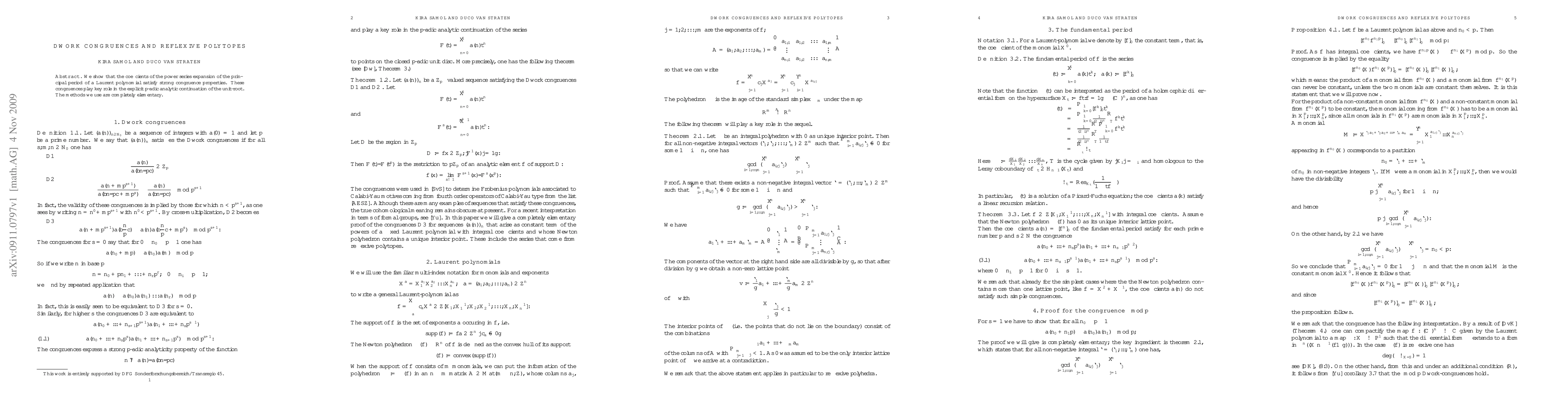 We show that the coefficients of the power series expansion of the principal period of a Laurent polynomial satisfy strong congruence properties. These congruences play a key role in the explicit p-adic analytic continuation of the unit root.