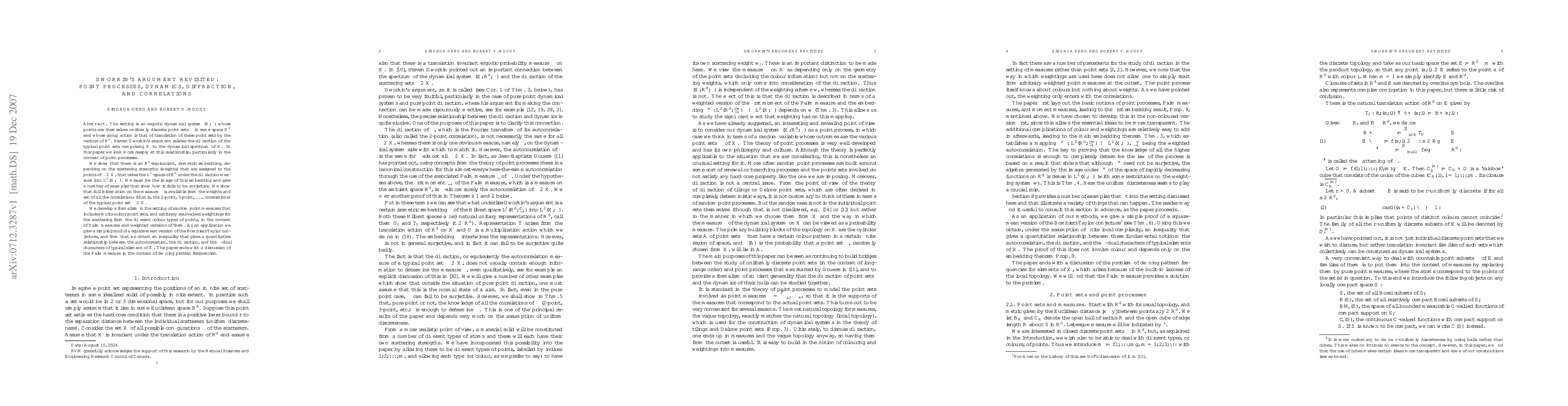 The paper studies the relationship between diffraction and dynamics for uniformly discrete ergodic point processes in real spaces. This relationship takes the form of an isometric embedding of two L^2 spaces. Diffraction (or equivalently the 2-point correlations) usually cannot determine the dynamics entirely, but we prove that knowledge of all the higher correlations (2-point, 3-point, ...) does. A square-mean form of the Bombieri-Taylor conjecture is proved. A quantitative relation between autocorrelation, diffraction, and epsilon dual characters is derived. Most results of the paper are proved in the setting of multi-colour points and assignable scattering strengths.