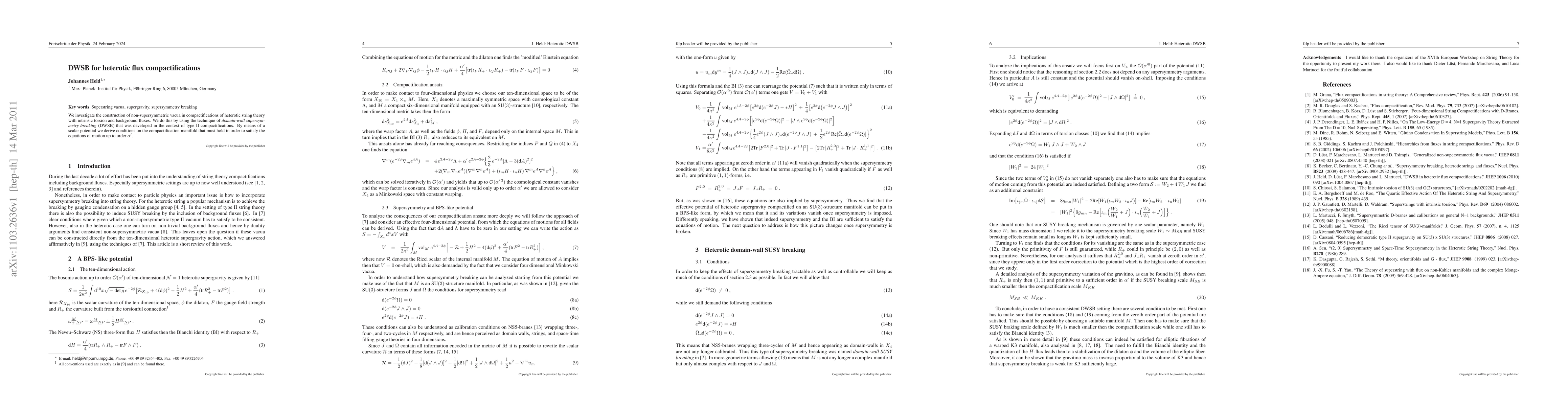 This paper explores the creation of non-supersymmetric vacua in heterotic string theory compactifications involving intrinsic torsion and background fluxes, employing domain-wall supersymmetry breaking (DWSB). It derives conditions on the compactification manifold necessary to satisfy the equations of motion to first-order in alpha'.