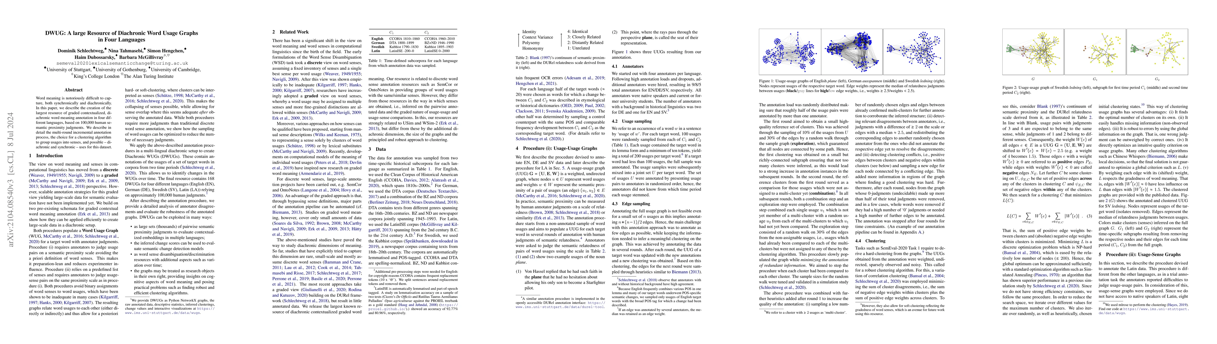 This paper introduces DWUG, a large dataset of diachronic word meaning annotations in four languages, derived from 100,000 human semantic proximity judgments. The dataset offers a new resource for studying word meanings over time.