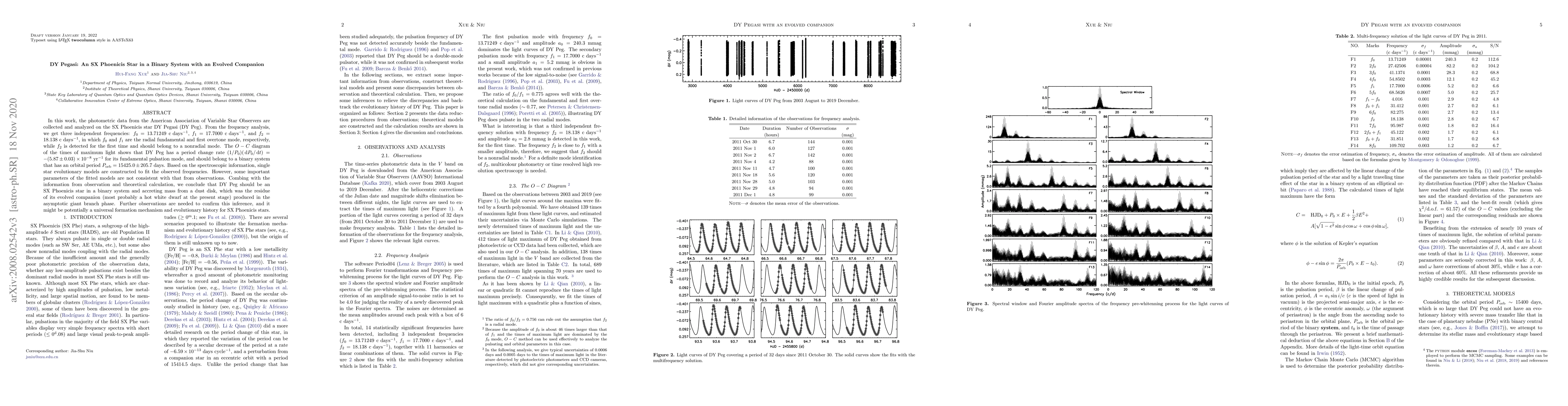 In this work, the photometric data from the American Association of Variable Star Observers are collected and analyzed on the SX Phoenicis star DY Pegasi (DY Peg). From the frequency analysis, we get three independent frequencies: $f_0 = 13.71249\ \rm{c\ days^{-1}}$, $f_1 = 17.7000\ \rm{c\ days^{-1}}$, and $f_2 =18.138\ \rm{c\ days^{-1}}$, in which $f_0$ and $f_1$ are the radial fundamental and first overtone mode, respectively, while $f_2$ is detected for the first time and should belong to a nonradial mode. The $O-C$ diagram of the times of maximum light shows that DY Peg has a period change rate $(1/P_0)(\mathrm{d} P_0/\mathrm{d} t) = -(5.87 \pm 0.03) \times 10^{-8} \ \mathrm{yr^{-1}}$ for its fundamental pulsation mode, and should belong to a binary system that has an orbital period $P_{\mathrm{orb}} = 15425.0 \pm 205.7 \ \mathrm{days}$. Based on the spectroscopic information, single star evolutionary models are constructed to fit the observed frequencies. However, some important parameters of the fitted models are not consistent with that from observations. Combing with the information from observation and theoretical calculation, we conclude that DY Peg should be an SX Phoenicis star in a binary system and accreting mass from a dust disk, which was the residue of its evolved companion (most probably a hot white dwarf at the present stage) produced in the asymptotic giant branch phase. Further observations are needed to confirm this inference, and it might be potentially a universal formation mechanism and evolutionary history for SX Phoenicis stars.