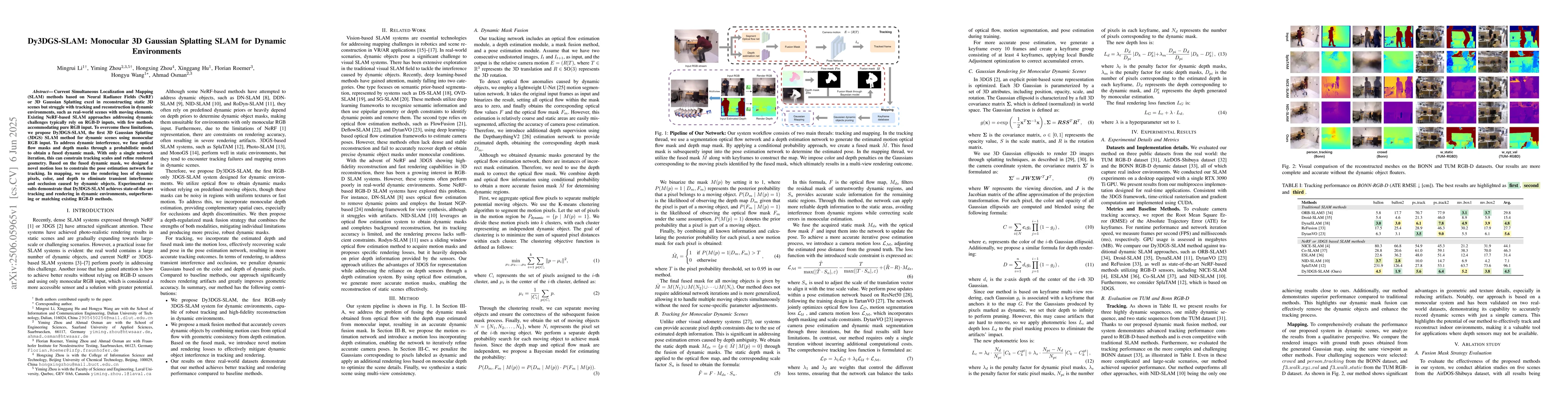 The paper proposes Dy3DGS-SLAM, a monocular 3D Gaussian Splatting SLAM method for dynamic environments, using optical flow masks and depth masks fused through a probabilistic model to constrain tracking scales and refine rendered geometry. It introduces a novel motion loss for pose estimation and a rendering loss for dynamic pixels, color, and depth to eliminate transient interference and occlusion caused by dynamic objects.
