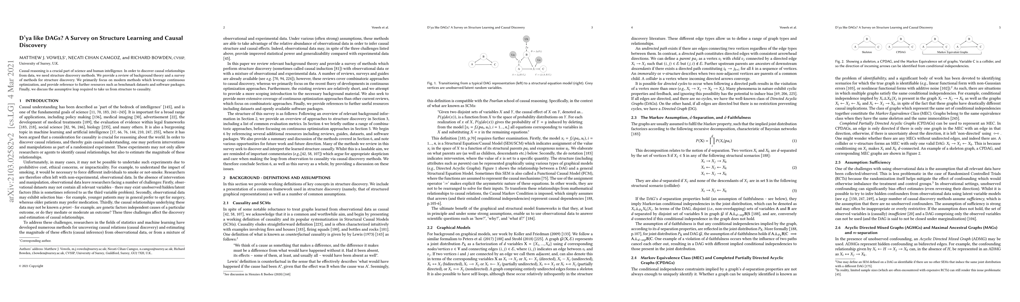 Causal reasoning is a crucial part of science and human intelligence. In order to discover causal relationships from data, we need structure discovery methods. We provide a review of background theory and a survey of methods for structure discovery. We primarily focus on modern, continuous optimization methods, and provide reference to further resources such as benchmark datasets and software packages. Finally, we discuss the assumptive leap required to take us from structure to causality.