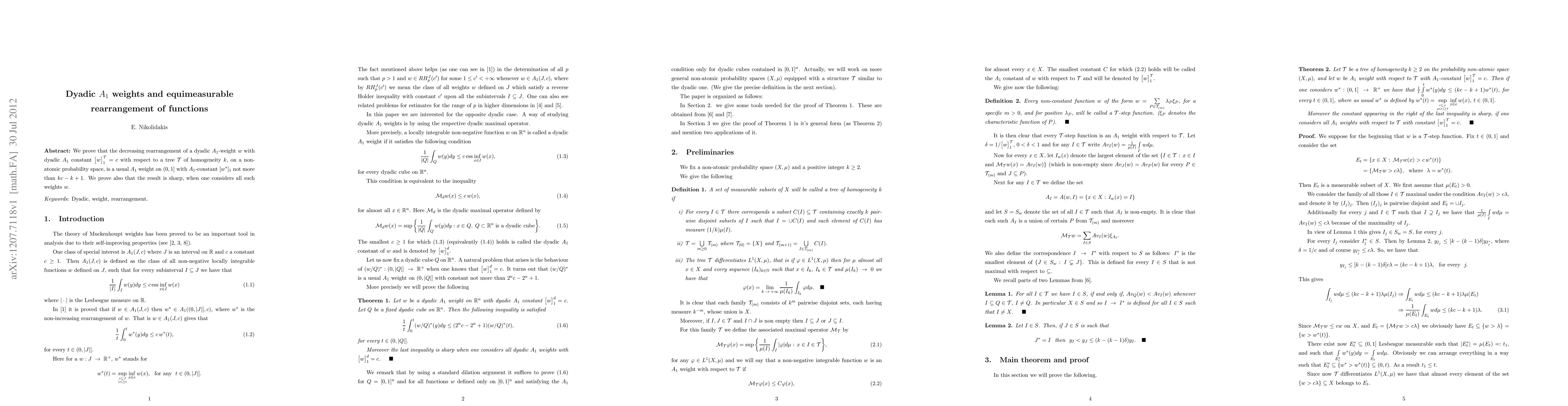 We prove that the decreasing rearrangement of a dyadic A1 weight w with dyadic A1 constant [w]_{1,T}=c with respect to a tree T of homogeneity k,on a non-atomic probability space, is a usual A1 weight on (0,1] with A1 constant not more than kc-k+1.We prove also that the result is sharp, when one considers all such weights w.