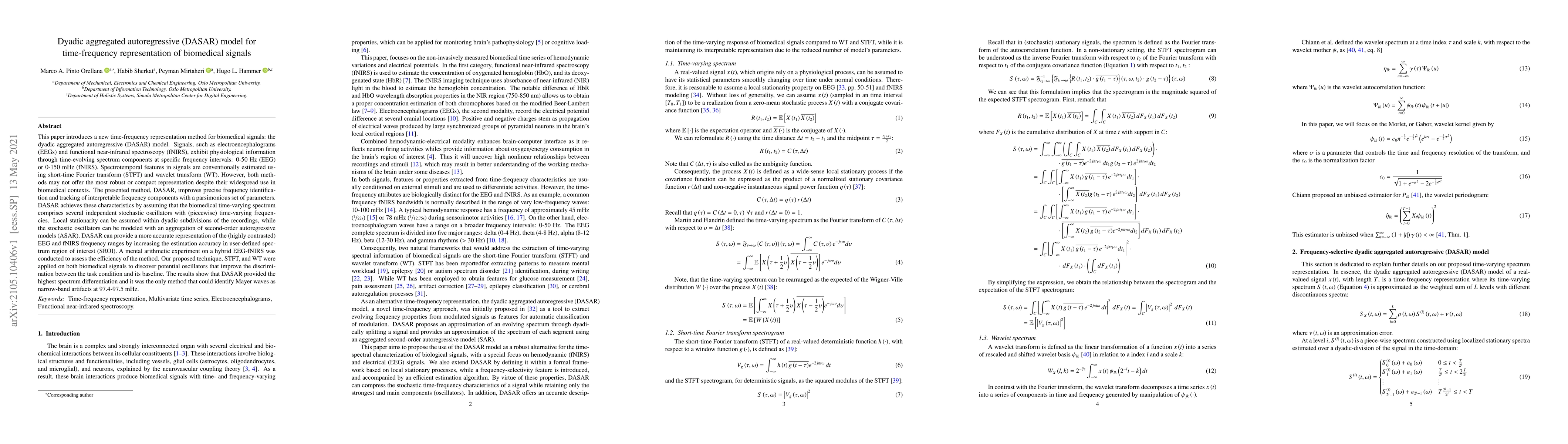 The paper introduces the dyadic aggregated autoregressive (DASAR) model for improved time-frequency representation of biomedical signals like EEGs and fNIRS, offering better frequency identification and tracking compared to STFT and WT. DASAR models the spectrum as independent stochastic oscillators, achieving higher accuracy in specified frequency regions.