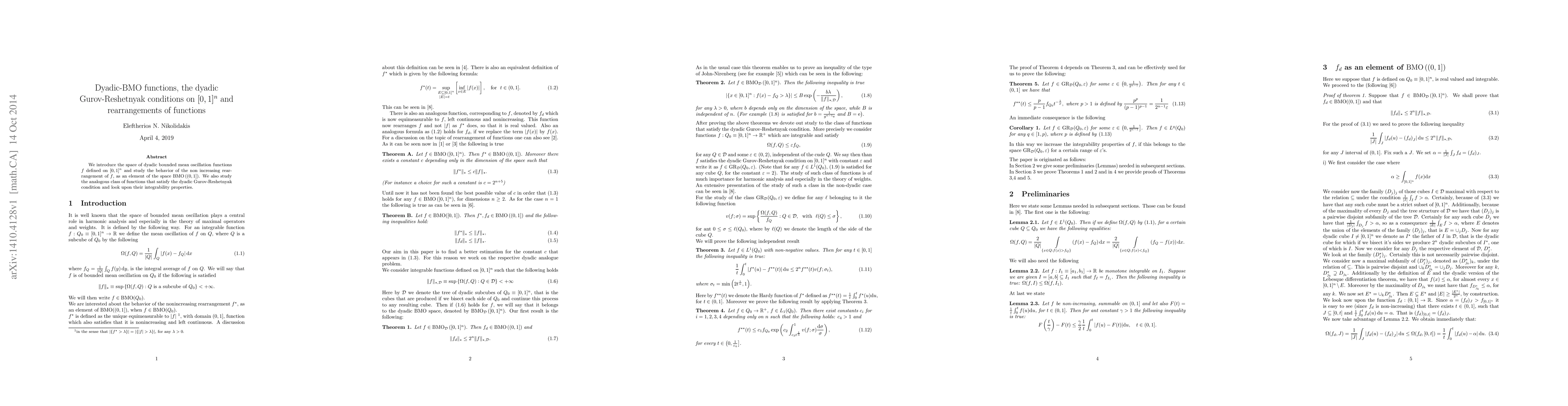 This paper introduces dyadic bounded mean oscillation functions on $[0,1]^n$ and examines their nonincreasing rearrangements within $BMO((0,1])$. It also investigates functions satisfying the dyadic Gurov-Reshetnyak condition and analyzes their integrability properties.