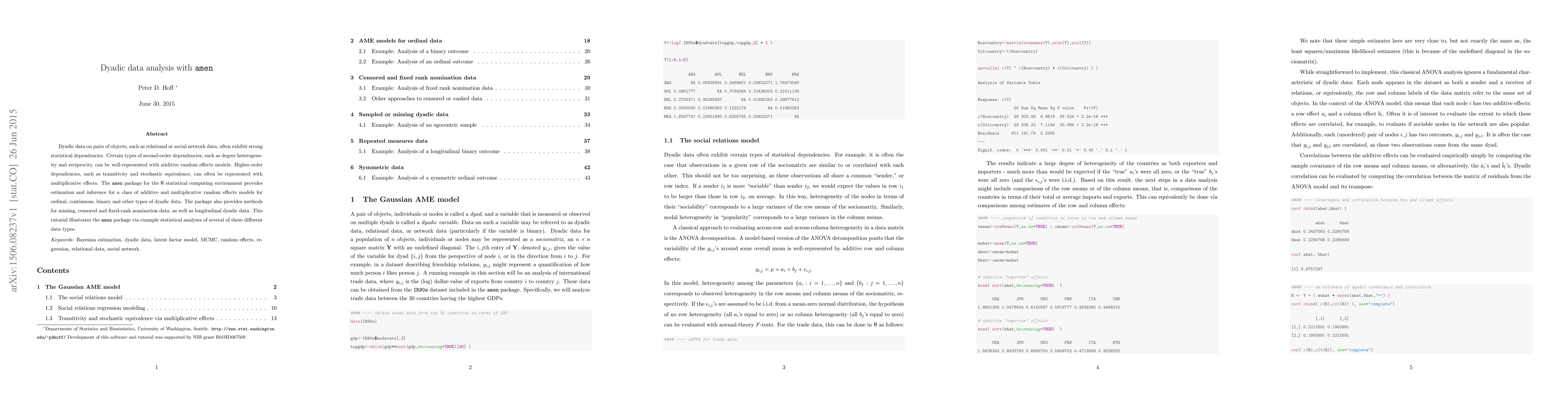 This paper introduces the amen package in R for analyzing dyadic data with additive and multiplicative random effects models, enabling accurate representation of various statistical dependencies.