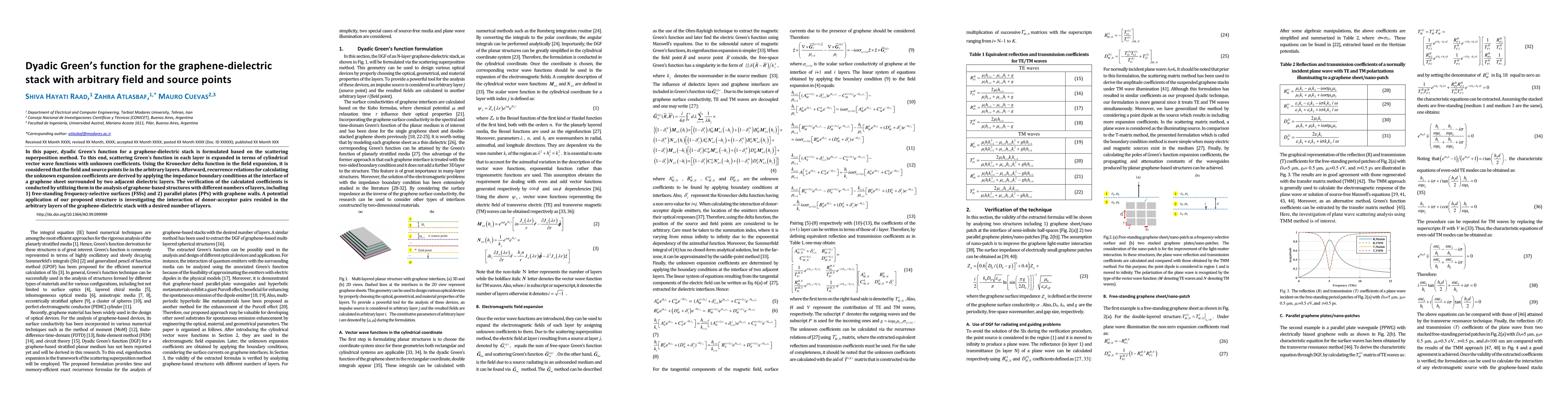 This paper formulates a dyadic Green's function for a graphene-dielectric stack using the scattering superposition method, deriving recurrence relations for expansion coefficients via impedance boundary conditions. The method is validated through analysis of graphene-based structures, with potential applications in studying interactions within donor-acceptor pairs in multi-layer graphene-dielectric stacks.