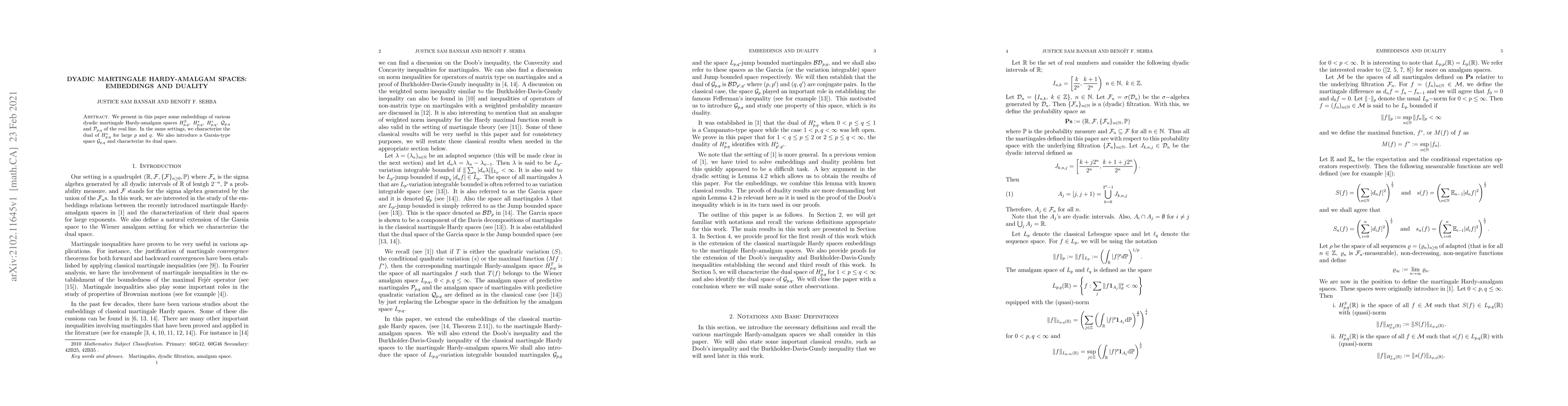 This paper explores embeddings of various dyadic martingale Hardy-amalgam spaces on the real line and characterizes the dual of $H^s_{p,q}$ for large $p$ and $q$. Additionally, it introduces a Garsia-type space $\mathcal{G}_{p,q}$ and defines its dual space.