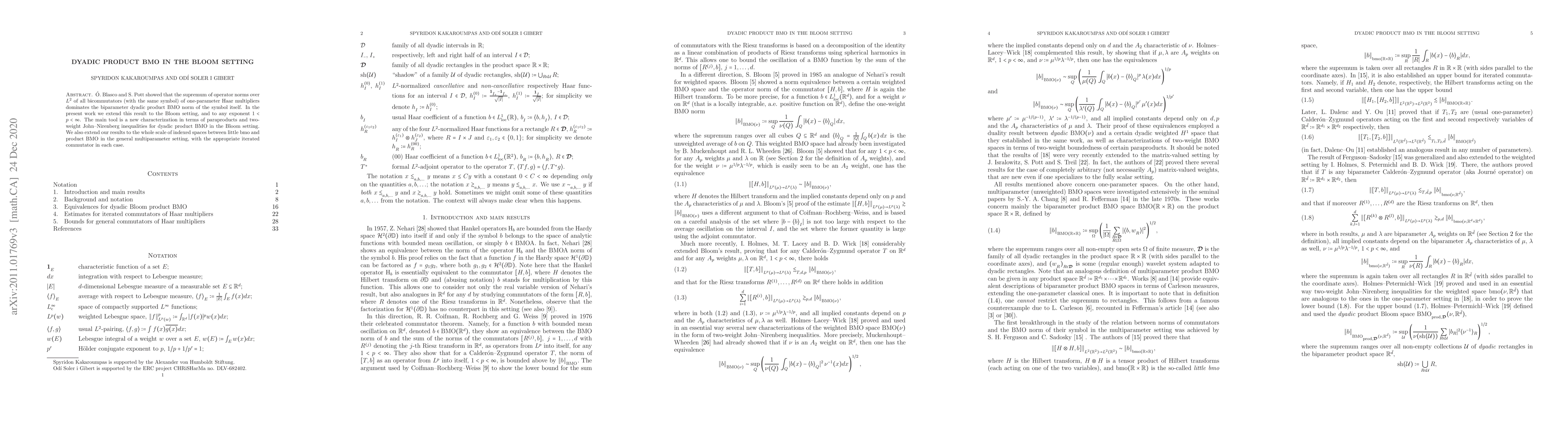 This paper extends the result by Blasco and Pott on bicommutators and dyadic product BMO norms to the Bloom setting for any exponent $1<p<\infty$. The authors utilize a new characterization involving paraproducts and two-weight John-Nirenberg inequalities, and generalize their findings to a broader range of multiparameter indexed spaces.