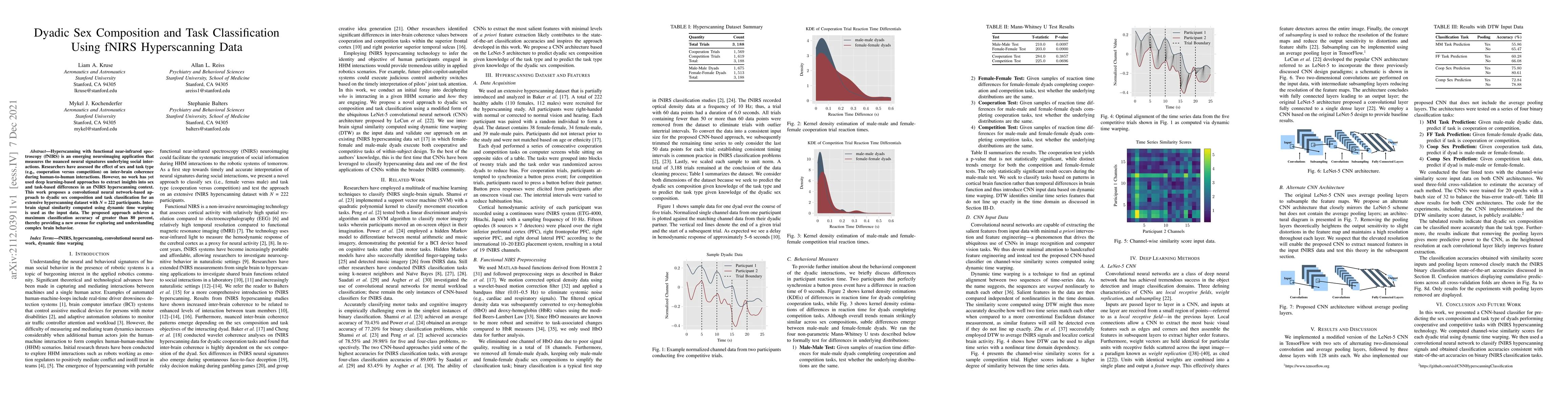 This paper proposes a convolutional neural network to classify dyadic sex composition and task type (cooperation vs. competition) using fNIRS hyperscanning data, achieving over 80% accuracy. It leverages inter-brain signal similarity from dynamic time warping as input, offering new insights into social interaction dynamics.