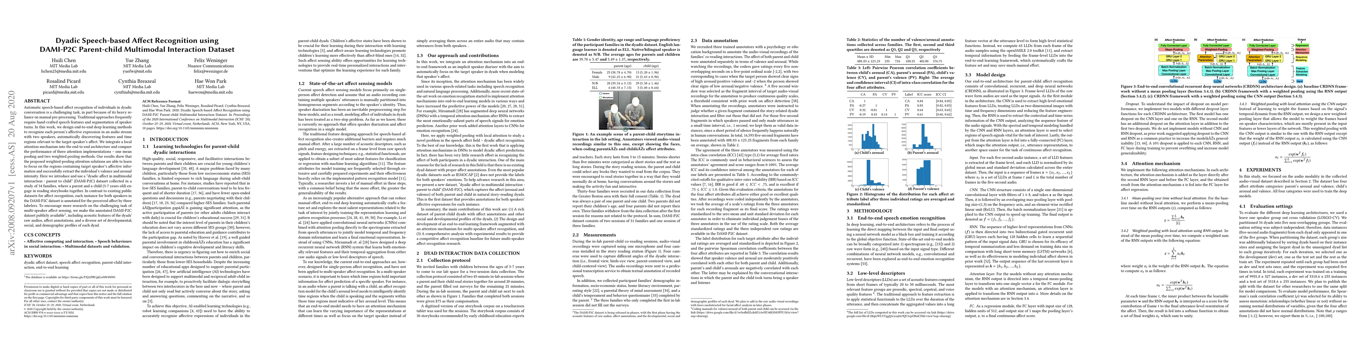 This paper proposes end-to-end deep learning methods for automatic speech-based affect recognition in dyadic conversations, using a new DAMI-P2C dataset of parent-child interactions. The study introduces weighted-pooling attention mechanisms that outperform mean pooling in focusing on relevant affective information, achieving better valence and arousal intensity detection.