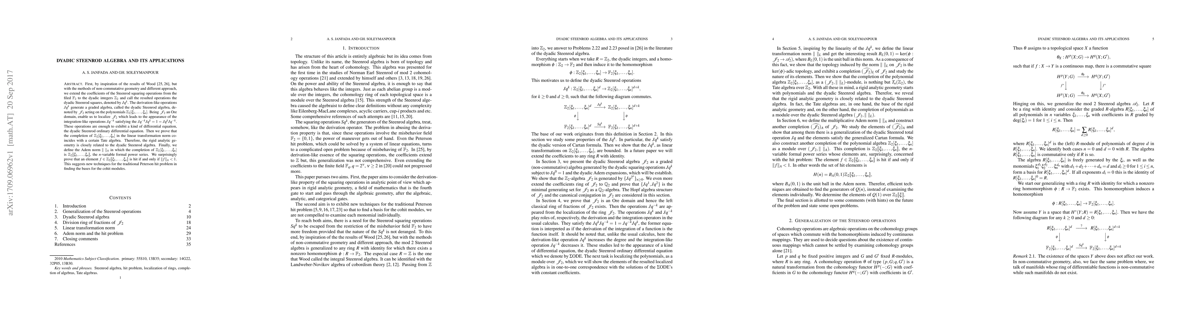 First, by inspiration of the results of Wood \cite{differential,problems}, but with the methods of non-commutative geometry and different approach, we extend the coefficients of the Steenrod squaring operations from the filed $\mathbb{F}_2$ to the dyadic integers $\mathbb{Z}_2$ and call the resulted operations the dyadic Steenrod squares, denoted by $Jq^k$. The derivation-like operations $Jq^k$ generate a graded algebra, called the dyadic Steenrod algebra, denoted by $\mathcal{J}_2$ acting on the polynomials $\mathbb{Z}_2[\xi_1, \dots, \xi_n]$. Being $\mathcal{J}_2$ an Ore domain, enable us to localize $\mathcal{J}_2$ which leads to the appearance of the integration-like operations $Jq^{-k}$ satisfying the $Jq^{-k}Jq^k=1=Jq^kJq^{-k}$. These operations are enough to exhibit a kind of differential equation, the dyadic Steenrod ordinary differential equation. Then we prove that the completion of $\mathbb{Z}_2[\xi_1, \dots, \xi_n]$ in the linear transformation norm coincides with a certain Tate algebra. Therefore, the rigid analytic geometry is closely related to the dyadic Steenrod algebra. Finally, we define the Adem norm $\| \ \|_A$ in which the completion of $\mathbb{Z}_2[\xi_1, \dots, \xi_n]$ is $\mathbb{Z}_2\llbracket\xi_1,\dots,\xi_n\rrbracket$, the $n$-variable formal power series. We surprisingly prove that an element $f \in \mathbb{Z}_2\llbracket \xi_1,\dots,\xi_n\rrbracket$ is hit if and only if $\|f\|_A<1$. This suggests new techniques for the traditional Peterson hit problem in finding the bases for the cohit modules.