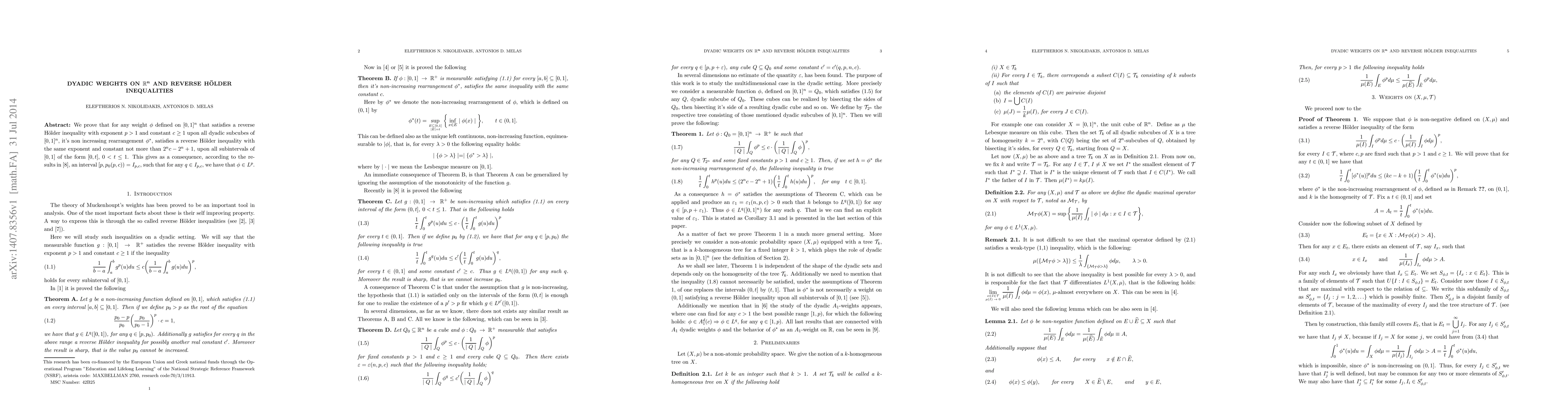 We prove that for any weight $\phi$ defined on $[0,1]^n$ that satisfies a reverse Holder inequality with exponent p > 1 and constant $c\ge1$ upon all dyadic subcubes of $[0,1]^n$, it's non increasing rearrangement satisfies a reverse Holder inequality with the same exponent and constant not more than $2^nc-2^n + 1$, upon all subintervals of $[0; 1]$ of the form $[0; t]$. This gives as a consequence, according to the results in [8], an interval $[p; p_0(p; c)) = I{p,c}$, such that for any $q \in I{p,c}$, we have that $\phi$ is in $L^q$.