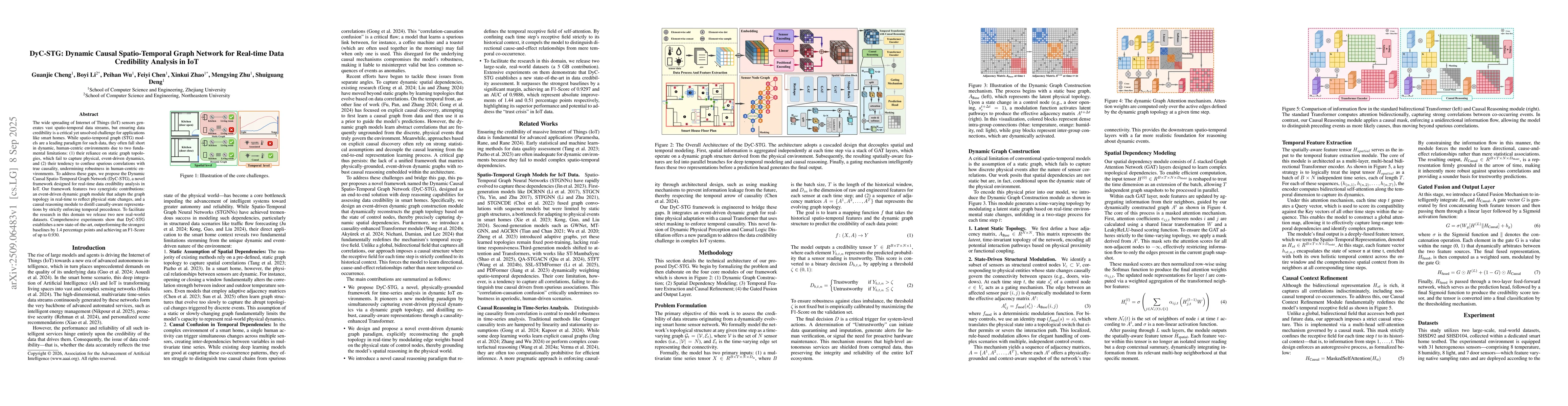 The wide spreading of Internet of Things (IoT) sensors generates vast spatio-temporal data streams, but ensuring data credibility is a critical yet unsolved challenge for applications like smart homes. While spatio-temporal graph (STG) models are a leading paradigm for such data, they often fall short in dynamic, human-centric environments due to two fundamental limitations: (1) their reliance on static graph topologies, which fail to capture physical, event-driven dynamics, and (2) their tendency to confuse spurious correlations with true causality, undermining robustness in human-centric environments. To address these gaps, we propose the Dynamic Causal Spatio-Temporal Graph Network (DyC-STG), a novel framework designed for real-time data credibility analysis in IoT. Our framework features two synergistic contributions: an event-driven dynamic graph module that adapts the graph topology in real-time to reflect physical state changes, and a causal reasoning module to distill causally-aware representations by strictly enforcing temporal precedence. To facilitate the research in this domain we release two new real-world datasets. Comprehensive experiments show that DyC-STG establishes a new state-of-the-art, outperforming the strongest baselines by 1.4 percentage points and achieving an F1-Score of up to 0.930.