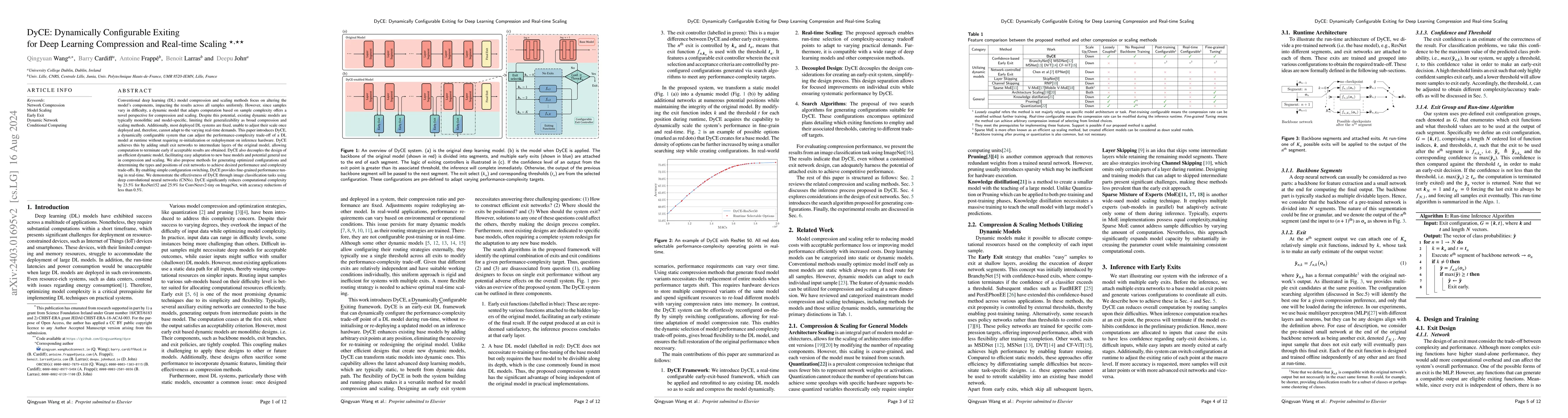 DyCE presents a dynamic configurable exiting framework for deep learning model compression, enabling flexible adaptation of exit points to manage computational complexity dynamically. It demonstrates significant reduction in complexity with minimal accuracy loss, offering real-time configuration and fine-grained performance tuning for various deep learning models.