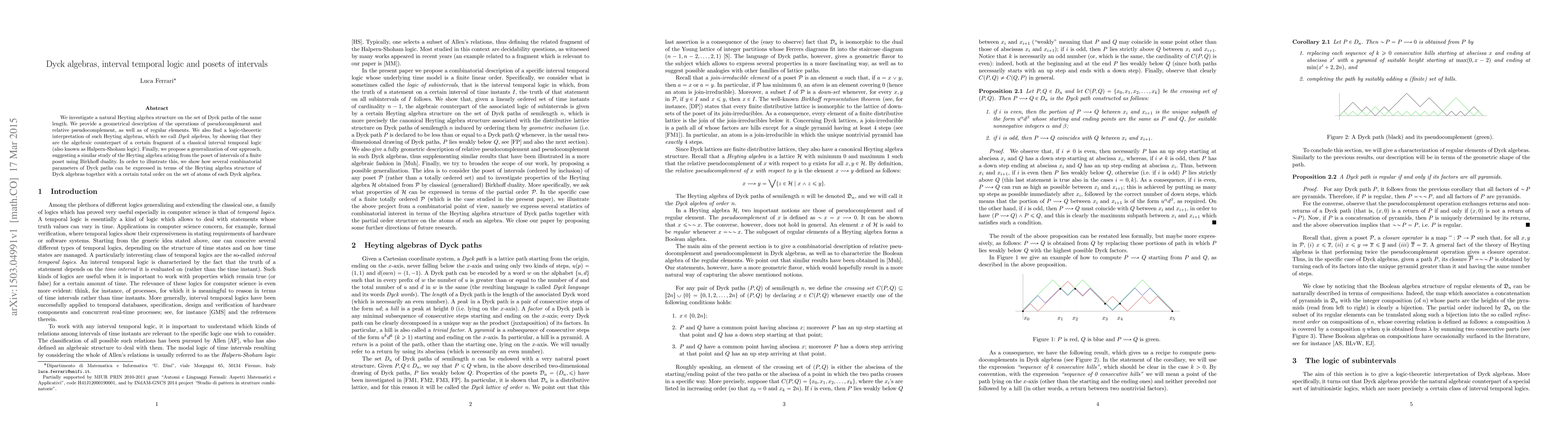 This paper explores the algebraic structure of Dyck paths as Heyting algebras, termed Dyck algebras, and links them to a fragment of interval temporal logic. It also applies Birkhoff duality to generalize the study to posets of intervals, illustrating combinatorial properties of Dyck paths through their algebraic structure.