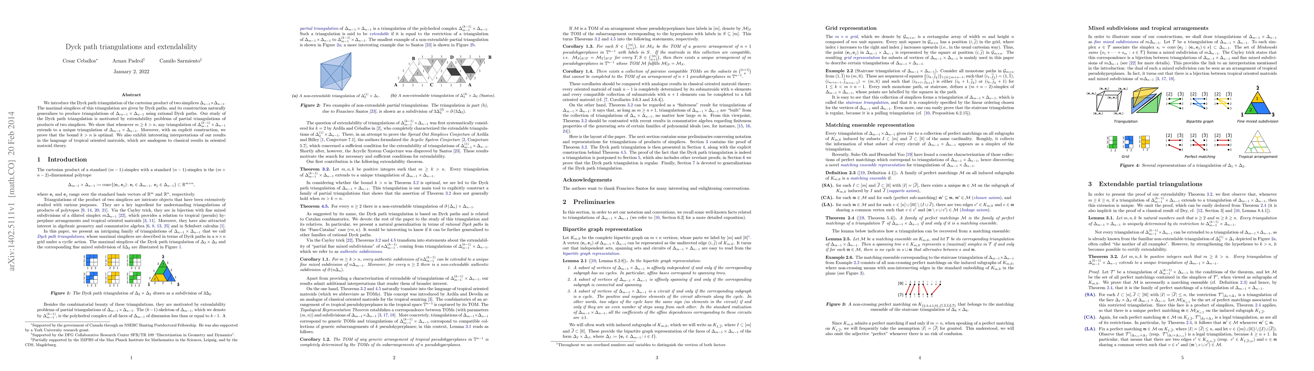 We introduce the Dyck path triangulation of the cartesian product of two simplices $\Delta_{n-1}\times\Delta_{n-1}$. The maximal simplices of this triangulation are given by Dyck paths, and its construction naturally generalizes to produce triangulations of $\Delta_{r\ n-1}\times\Delta_{n-1}$ using rational Dyck paths. Our study of the Dyck path triangulation is motivated by extendability problems of partial triangulations of products of two simplices. We show that whenever $m\geq k>n$, any triangulation of $\Delta_{m-1}^{(k-1)}\times\Delta_{n-1}$ extends to a unique triangulation of $\Delta_{m-1}\times\Delta_{n-1}$. Moreover, with an explicit construction, we prove that the bound $k>n$ is optimal. We also exhibit interesting interpretations of our results in the language of tropical oriented matroids, which are analogous to classical results in oriented matroid theory.