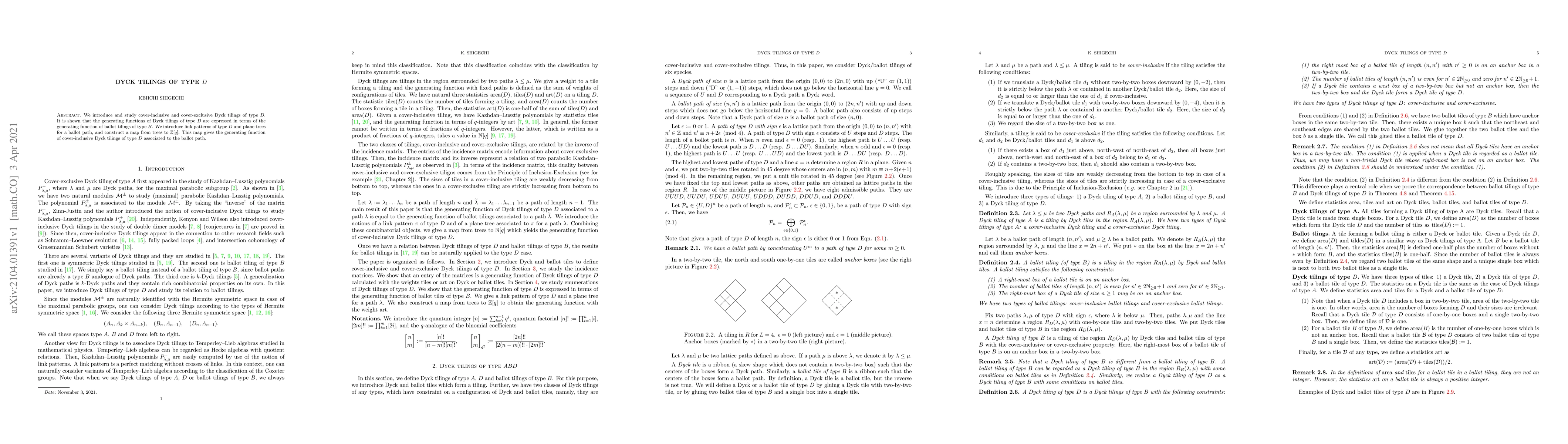 This paper explores cover-inclusive and cover-exclusive Dyck tilings of type $D$, establishing their generating functions in relation to ballot tilings of type $B$. It introduces link patterns and plane trees for ballot paths, and constructs a map to $\mathbb{Z}[q]$ to derive the generating function for cover-inclusive Dyck tilings.