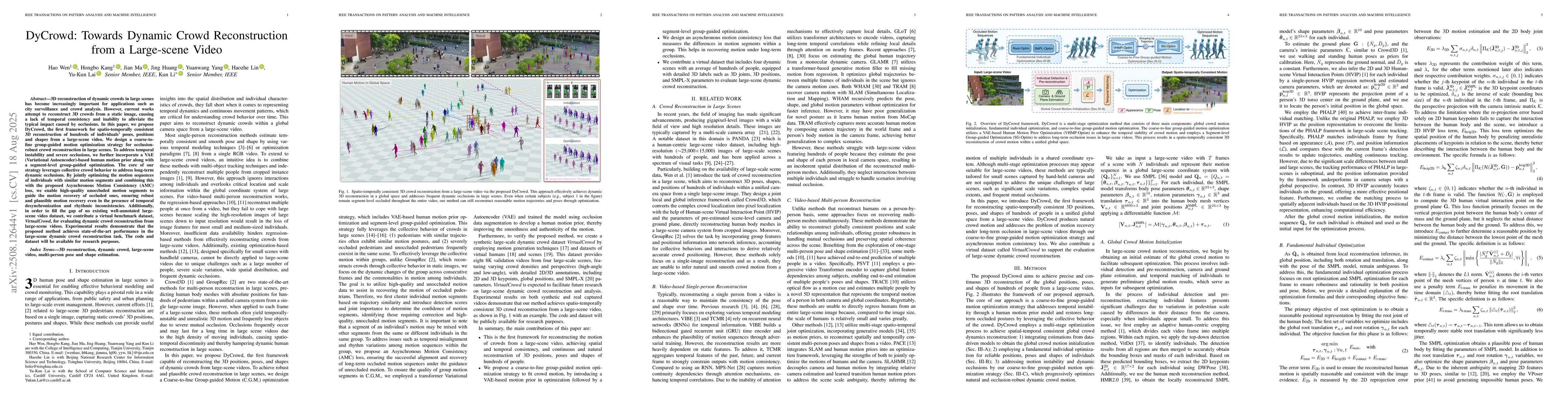 3D reconstruction of dynamic crowds in large scenes has become increasingly important for applications such as city surveillance and crowd analysis. However, current works attempt to reconstruct 3D crowds from a static image, causing a lack of temporal consistency and inability to alleviate the typical impact caused by occlusions. In this paper, we propose DyCrowd, the first framework for spatio-temporally consistent 3D reconstruction of hundreds of individuals' poses, positions and shapes from a large-scene video. We design a coarse-to-fine group-guided motion optimization strategy for occlusion-robust crowd reconstruction in large scenes. To address temporal instability and severe occlusions, we further incorporate a VAE (Variational Autoencoder)-based human motion prior along with a segment-level group-guided optimization. The core of our strategy leverages collective crowd behavior to address long-term dynamic occlusions. By jointly optimizing the motion sequences of individuals with similar motion segments and combining this with the proposed Asynchronous Motion Consistency (AMC) loss, we enable high-quality unoccluded motion segments to guide the motion recovery of occluded ones, ensuring robust and plausible motion recovery even in the presence of temporal desynchronization and rhythmic inconsistencies. Additionally, in order to fill the gap of no existing well-annotated large-scene video dataset, we contribute a virtual benchmark dataset, VirtualCrowd, for evaluating dynamic crowd reconstruction from large-scene videos. Experimental results demonstrate that the proposed method achieves state-of-the-art performance in the large-scene dynamic crowd reconstruction task. The code and dataset will be available for research purposes.