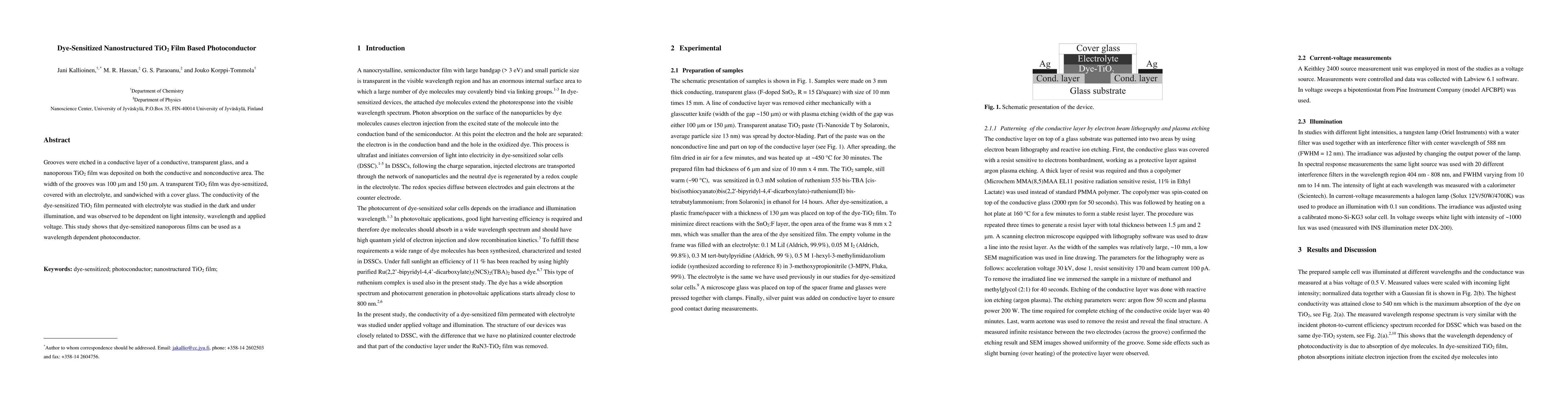 This research develops a dye-sensitized nanostructured TiO2 film with grooves etched in a transparent conductive layer, demonstrating its ability to function as a wavelength-dependent photoconductor, with conductivity varying based on light intensity, wavelength, and applied voltage.