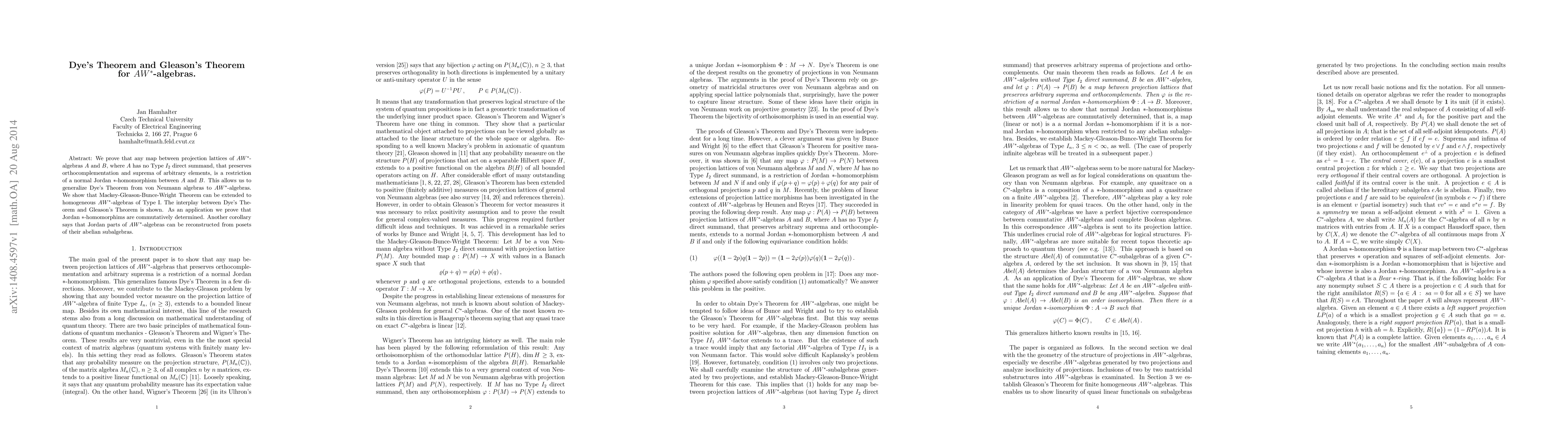 This paper extends Dye's Theorem and Gleason's Theorem to $AW^\ast$-algebras, proving that any map preserving orthocomplementation and suprema in such algebras is a restriction of a normal Jordan $\ast$-homomorphism. It also extends the Mackey-Gleason-Bunce-Wright Theorem to homogeneous Type I $AW^\ast$-algebras, demonstrating the commutative determination of Jordan $\ast$-homomorphisms.