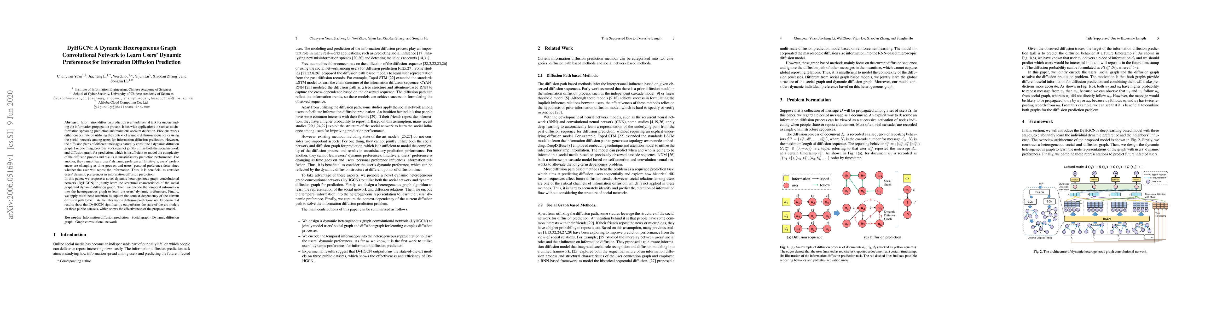 The paper proposes DyHGCN, a dynamic heterogeneous graph convolutional network, to predict information diffusion by jointly modeling social and diffusion graphs and learning users' dynamic preferences over time. Experimental results demonstrate DyHGCN's superior performance over existing models on multiple datasets.