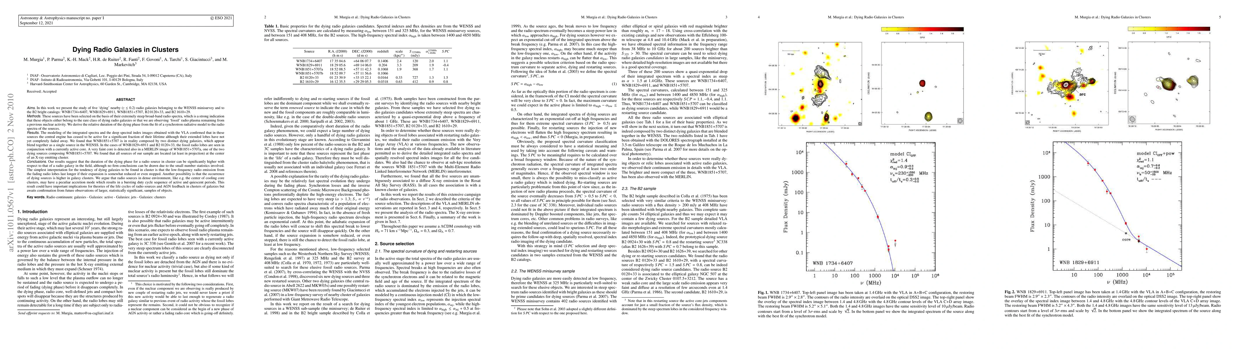 We present the study of five `dying' nearby radio galaxies belonging to the WENSS minisurvey and to the B2 bright catalogs: WNB1734+6407, WNB1829+6911, WNB1851+5707, B2 0120+33, and B2 1610+29. These sources have been selected on the basis of their extremely steep broad-band radio spectra. The modeling of the integrated spectra and the deep spectral index images obtained with the VLA confirmed that in these sources the central engine has ceased to be active for a significant fraction of their lifetime although their extended lobes have not yet completely faded away. We found that WNB1851+5707 is in reality composed by two distinct dying galaxies, which appear blend together as a single source in the WENSS. In the cases of WNB1829+6911 and B2 0120+33, the fossil radio lobes are seen in conjunction with a currently active core. A very faint core is detected also in a MERLIN image of WNB1851+5707a, one of the two dying sources composing WNB1851+5707. We found that all sources of our sample are located (at least in projection) at the center of an X-ray emitting cluster. Our results suggest that the duration of the dying phase for a radio source in cluster can be significantly higher with respect to that of a radio galaxy in the field. The simplest interpretation is that the low-frequency emission from the fading radio lobes last longer if their expansion is somewhat reduced or even stopped. Another possibility is that the occurrence of dying sources is higher in galaxy clusters. Radio sources in dense environment, like e.g. the center of cooling core clusters, may have a peculiar accretion mode which results in a bursting duty cycle sequence of active and quiescent periods. This result could have important implications for theories of the life cycles of radio sources and AGN feedback in clusters of galaxies but awaits confirmation from future observations of larger samples of objects.