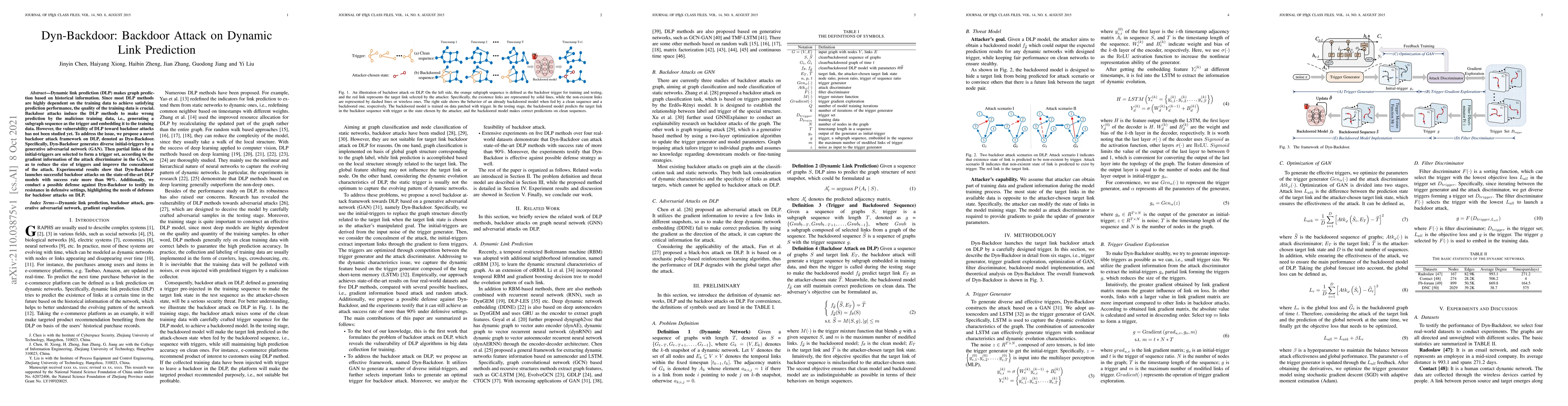 The paper introduces Dyn-Backdoor, a novel backdoor attack framework targeting dynamic link prediction (DLP) methods, which leverages GANs to generate and embed triggers in training data to manipulate predictions. Experimental results demonstrate over 90% success rate in attacking state-of-the-art DLP models, highlighting the need for defenses against such attacks.