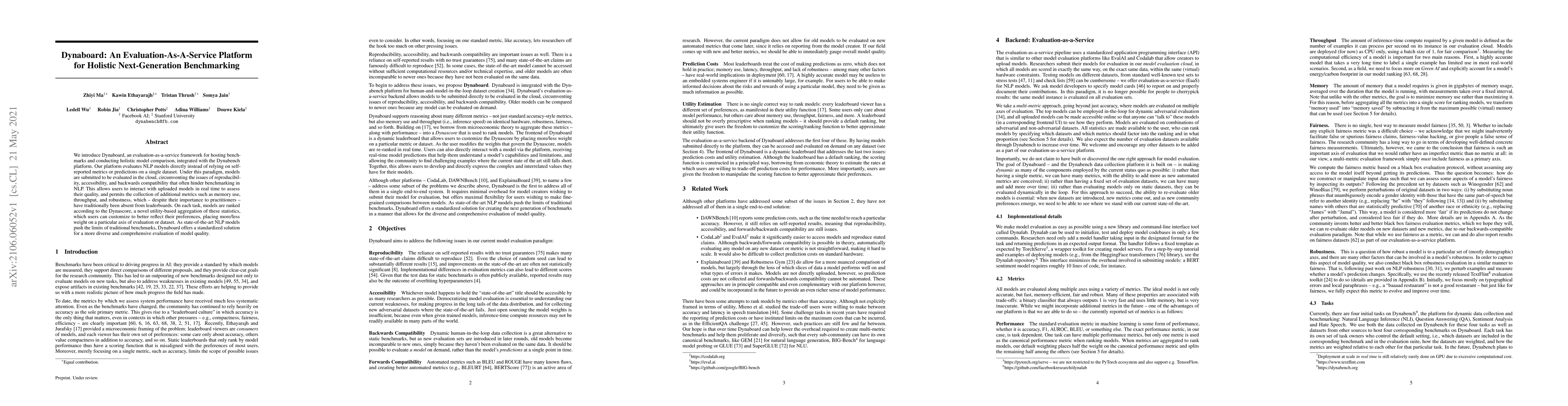 Dynaboard is an evaluation-as-a-service platform that facilitates holistic benchmarking of NLP models by directly assessing them in the cloud, addressing issues like reproducibility and accessibility. It ranks models using the Dynascore, a customizable utility-based metric that includes diverse evaluation aspects beyond traditional metrics.