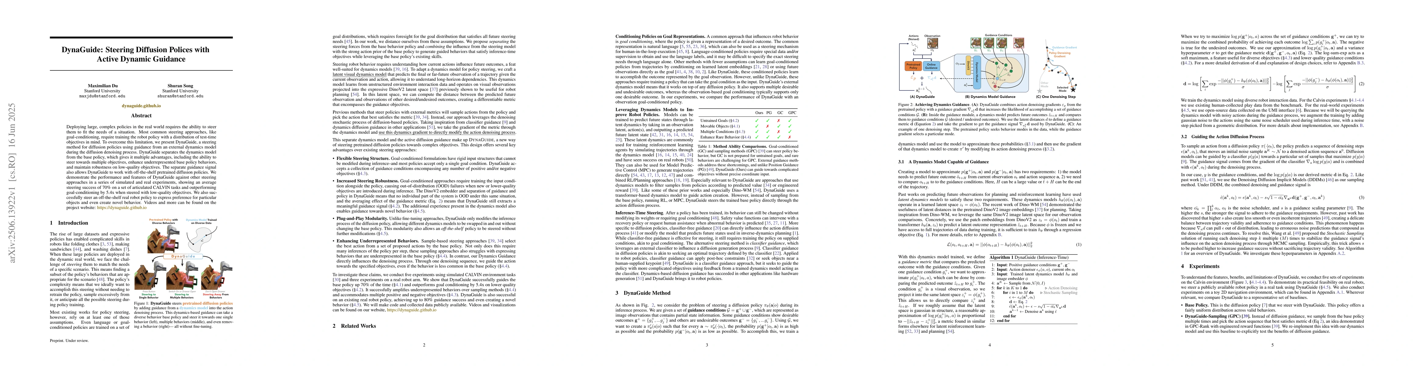 Deploying large, complex policies in the real world requires the ability to steer them to fit the needs of a situation. Most common steering approaches, like goal-conditioning, require training the robot policy with a distribution of test-time objectives in mind. To overcome this limitation, we present DynaGuide, a steering method for diffusion policies using guidance from an external dynamics model during the diffusion denoising process. DynaGuide separates the dynamics model from the base policy, which gives it multiple advantages, including the ability to steer towards multiple objectives, enhance underrepresented base policy behaviors, and maintain robustness on low-quality objectives. The separate guidance signal also allows DynaGuide to work with off-the-shelf pretrained diffusion policies. We demonstrate the performance and features of DynaGuide against other steering approaches in a series of simulated and real experiments, showing an average steering success of 70% on a set of articulated CALVIN tasks and outperforming goal-conditioning by 5.4x when steered with low-quality objectives. We also successfully steer an off-the-shelf real robot policy to express preference for particular objects and even create novel behavior. Videos and more can be found on the project website: https://dynaguide.github.io