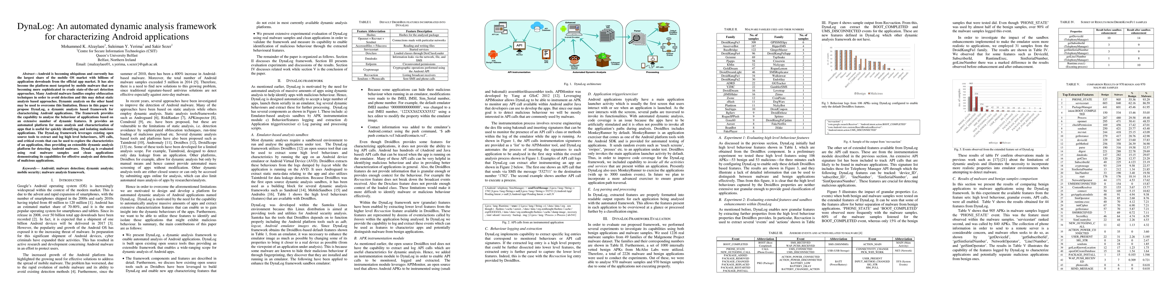 DynaLog is a dynamic analysis framework designed to characterize Android applications by leveraging extensive dynamic features to detect malware. It automates the analysis process, utilizing open source tools to log behaviors and API calls, and has been evaluated effectively against real malware and clean apps.