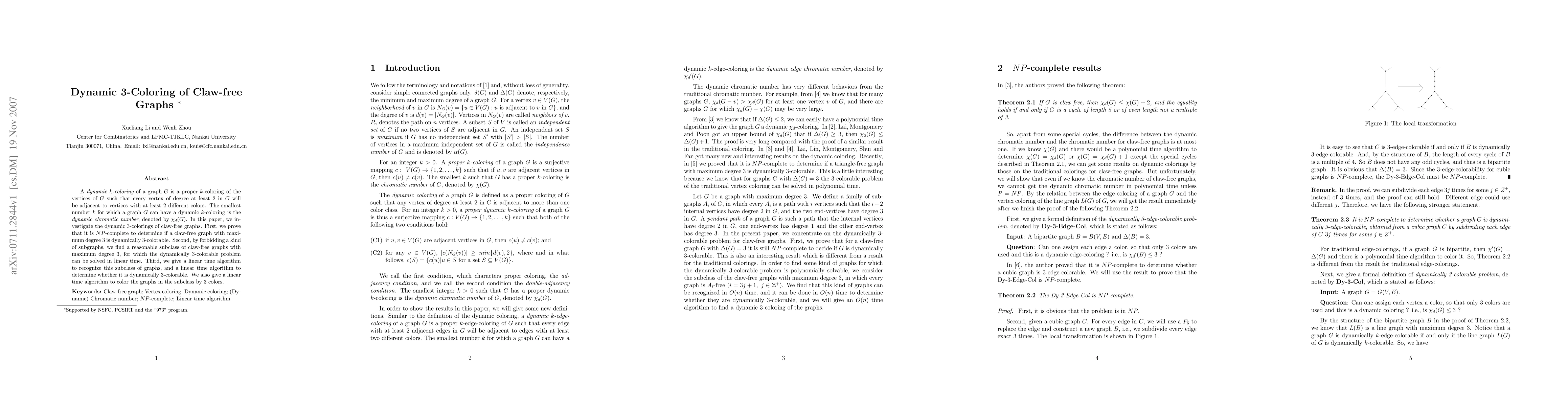 A {\it dynamic $k$-coloring} of a graph $G$ is a proper $k$-coloring of the vertices of $G$ such that every vertex of degree at least 2 in $G$ will be adjacent to vertices with at least 2 different colors. The smallest number $k$ for which a graph $G$ can have a dynamic $k$-coloring is the {\it dynamic chromatic number}, denoted by $\chi_d(G)$. In this paper, we investigate the dynamic 3-colorings of claw-free graphs. First, we prove that it is $NP$-complete to determine if a claw-free graph with maximum degree 3 is dynamically 3-colorable. Second, by forbidding a kind of subgraphs, we find a reasonable subclass of claw-free graphs with maximum degree 3, for which the dynamically 3-colorable problem can be solved in linear time. Third, we give a linear time algorithm to recognize this subclass of graphs, and a linear time algorithm to determine whether it is dynamically 3-colorable. We also give a linear time algorithm to color the graphs in the subclass by 3 colors.