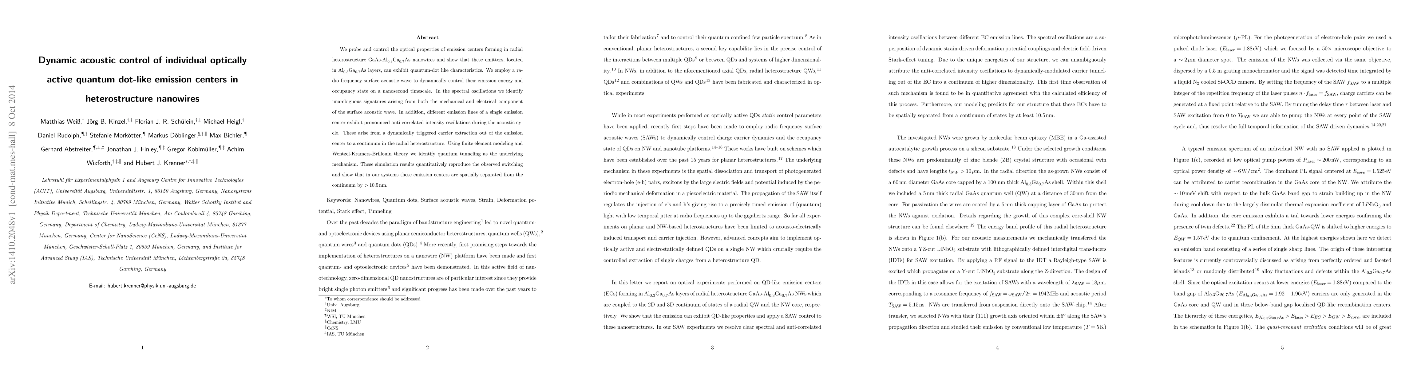 We probe and control the optical properties of emission centers forming in radial het- erostructure GaAs-Al0.3Ga0.7As nanowires and show that these emitters, located in Al0.3Ga0.7As layers, can exhibit quantum-dot like characteristics. We employ a radio frequency surface acoustic wave to dynamically control their emission energy and occupancy state on a nanosec- ond timescale. In the spectral oscillations we identify unambiguous signatures arising from both the mechanical and electrical component of the surface acoustic wave. In addition, differ- ent emission lines of a single quantum dot exhibit pronounced anti-correlated intensity oscilla- tions during the acoustic cycle. These arise from a dynamically triggered carrier extraction out of the quantum dot to a continuum in the radial heterostructure. Using finite element modeling and Wentzel-Kramers-Brillouin theory we identify quantum tunneling as the underlying mech- anism. These simulation results quantitatively reproduce the observed switching and show that in our systems these quantum dots are spatially separated from the continuum by > 10.5 nm.