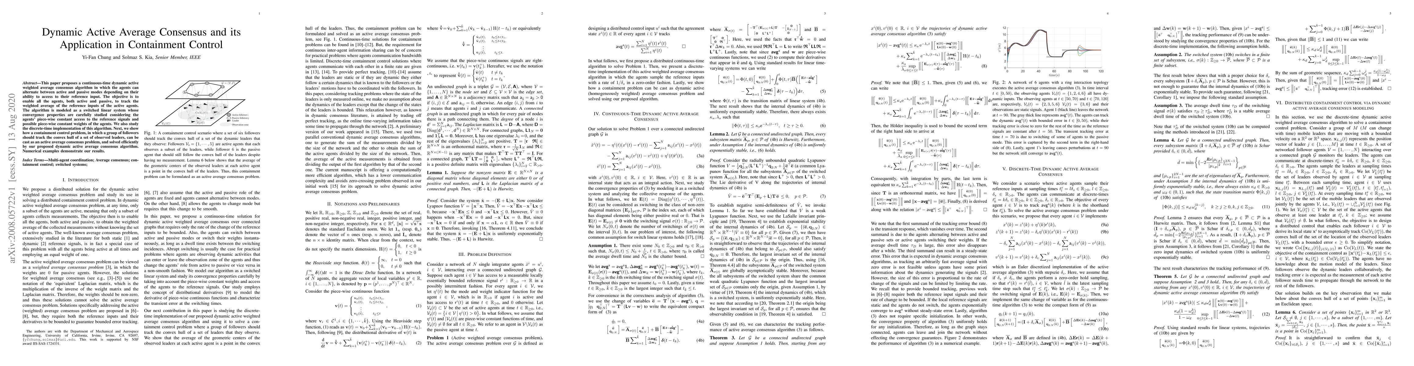 The paper proposes a continuous-time dynamic active weighted average consensus algorithm, modeled as a switched linear system, for agents to track the weighted average of active agents' reference inputs. It also provides a discrete-time implementation and demonstrates application in containment control.