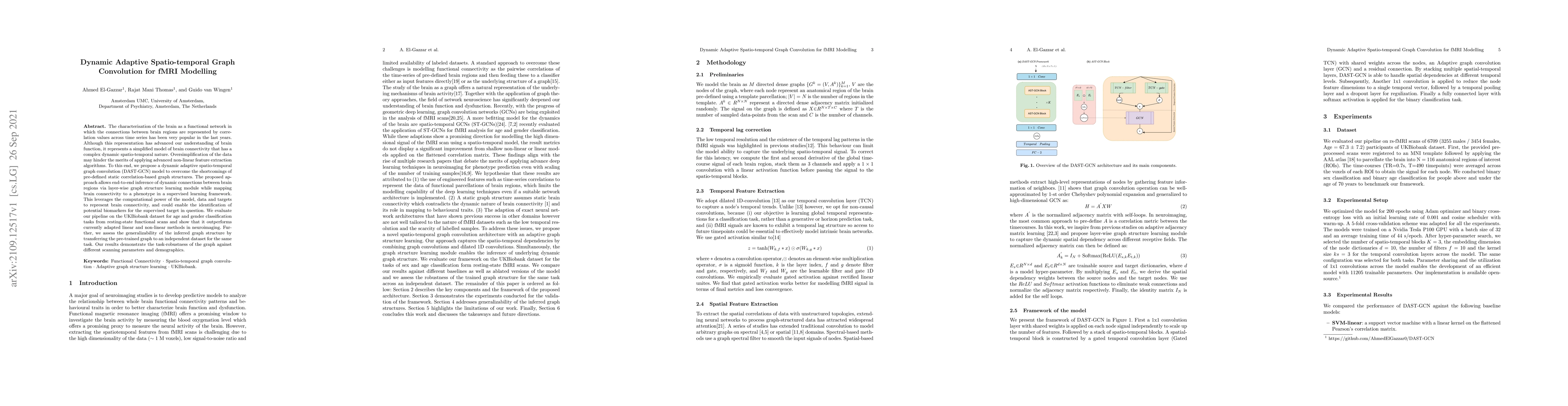 This paper proposes a dynamic adaptive spatio-temporal graph convolution model (DAST-GCN) to better represent the complex, dynamic nature of brain connectivity in fMRI data. The model outperforms existing methods for age and gender classification tasks, demonstrating its potential for identifying biomarkers and showing robust performance across different datasets and scanning parameters.