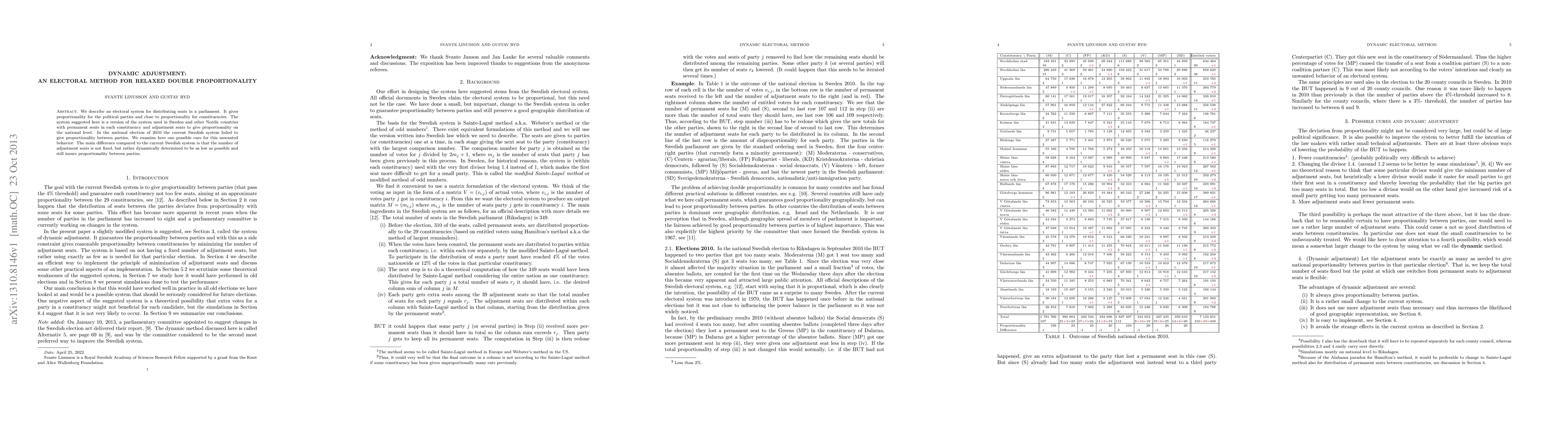We describe an electoral system for distributing seats in a parliament. It gives proportionality for the political parties and close to proportionality for constituencies. The system suggested here is a version of the system used in Sweden and other Nordic countries with permanent seats in each constituency and adjustment seats to give proportionality on the national level. In the national election of 2010 the current Swedish system failed to give proportionality between parties. We examine here one possible cure for this unwanted behavior. The main difference compared to the current Swedish system is that the number of adjustment seats is not fixed, but rather dynamically determined to be as low as possible and still insure proportionality between parties.