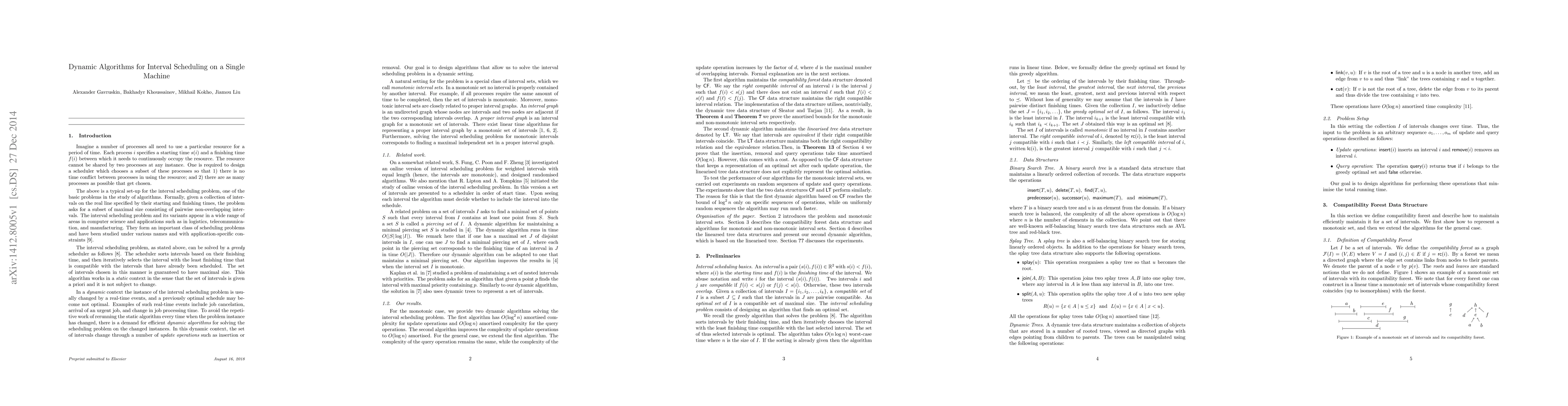 This paper presents dynamic algorithms for interval scheduling on a single machine, achieving amortized time complexities of $O(\log n)$ for query operations and $O(d\log^2 n)$ for insertion and removal, with $n$ and $d$ representing the number of intervals and overlapping pairs respectively. For monotonic intervals, the complexity improves to $O(\log n)$ for both query and update operations, and experimental results compare these algorithms.