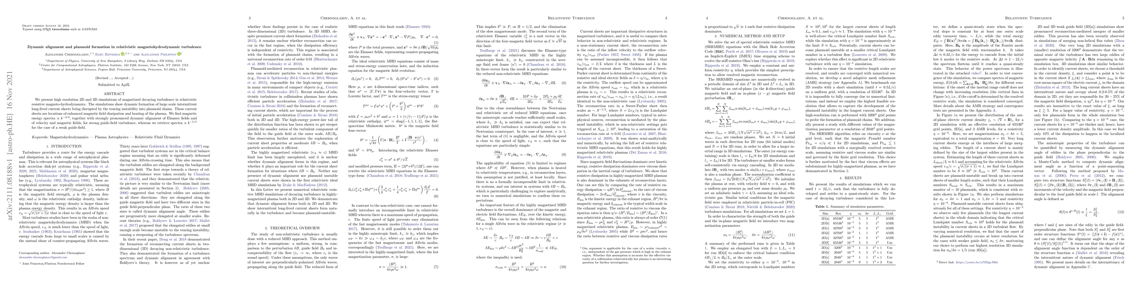 This paper investigates relativistic magnetohydrodynamic turbulence through high-resolution simulations, revealing the formation of long-lived current sheets disrupted by tearing instabilities into plasmoid chains, with enhanced magnetic dissipation and heating. The study shows dynamic alignment of Elsasser fields and spectra $\propto k^{-3/2}$ for strong guide-field turbulence, and $\propto k^{-5/3}$ for weak guide-field turbulence.