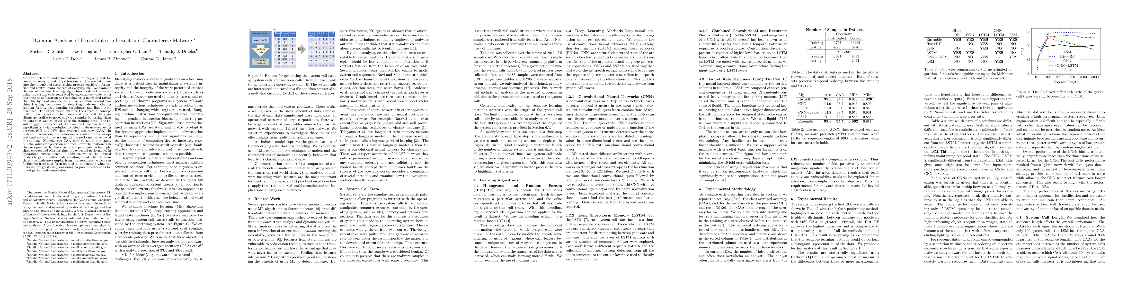 It is needed to ensure the integrity of systems that process sensitive information and control many aspects of everyday life. We examine the use of machine learning algorithms to detect malware using the system calls generated by executables-alleviating attempts at obfuscation as the behavior is monitored rather than the bytes of an executable. We examine several machine learning techniques for detecting malware including random forests, deep learning techniques, and liquid state machines. The experiments examine the effects of concept drift on each algorithm to understand how well the algorithms generalize to novel malware samples by testing them on data that was collected after the training data. The results suggest that each of the examined machine learning algorithms is a viable solution to detect malware-achieving between 90% and 95% class-averaged accuracy (CAA). In real-world scenarios, the performance evaluation on an operational network may not match the performance achieved in training. Namely, the CAA may be about the same, but the values for precision and recall over the malware can change significantly. We structure experiments to highlight these caveats and offer insights into expected performance in operational environments. In addition, we use the induced models to gain a better understanding about what differentiates the malware samples from the goodware, which can further be used as a forensics tool to understand what the malware (or goodware) was doing to provide directions for investigation and remediation.