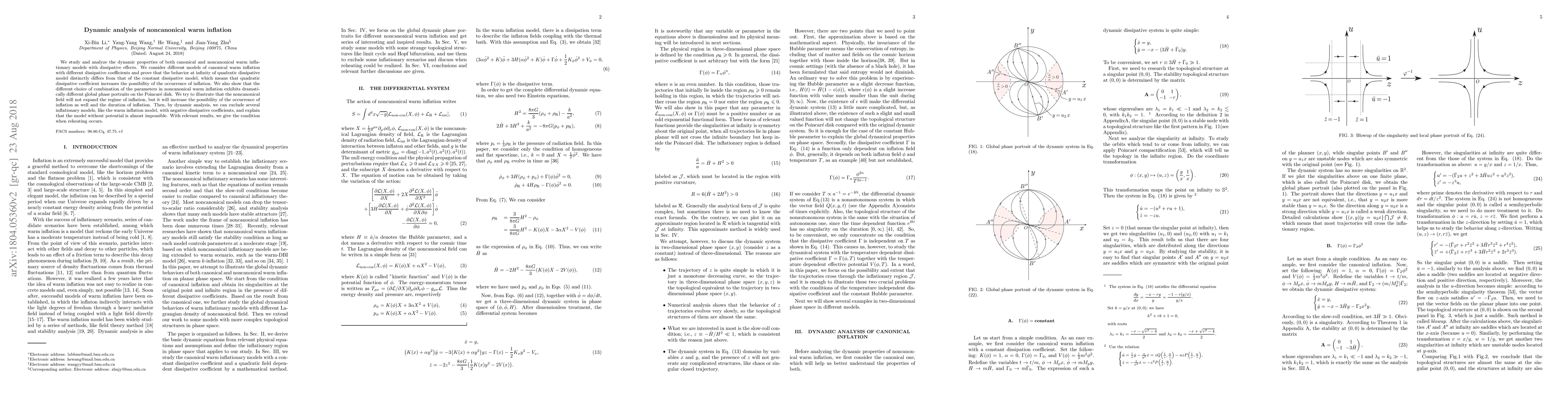 We study and analyze the dynamic properties of both canonical and noncanonical warm inflationary models with dissipative effects. We consider different models of canonical warm inflation with different dissipative coefficients and prove that the behavior at infinity of quadratic dissipative model distinctly differs from that of the constant dissipative model, which means that quadratic dissipative coefficient increases the possibility of the occurrence of inflation. We also show that the different choice of combination of the parameters in noncanonical warm inflation exhibits dramatically different global phase portraits on the Poincar\'{e} disk. We try to illustrate that the noncanonical field will not expand the regime of inflation, but it will increase the possibility of the occurrence of inflation as well and the duration of inflation. Then, by dynamic analysis, we can exclude several inflationary models, like the warm inflation model, with negative dissipative coefficients, and explain that the model without potential is almost impossible. With relevant results, we give the condition when reheating occurs.